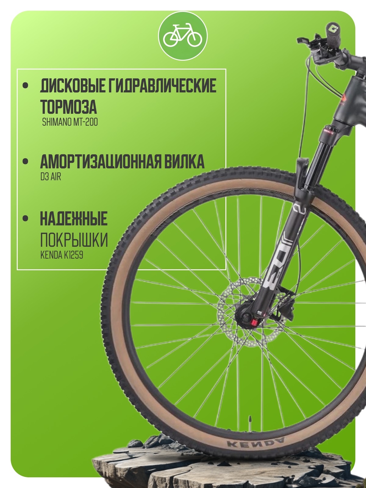 Горный велосипед с оборудованием предпрофессионального класса Shimano, 11 скоростей. Технические особенности: легкая алюминиевая рама (бесшовная, конусный стакан, полная внутренняя проводка, спорт геометрия), амортизационная вилка D3 Air (воздушная, ход 100 мм, алюминиевые ноги диаметром 30 мм, магниевые штаны, черная анодировка, гидравлическая блокировка, регулировка отскока), двойные алюминиевые обода (ширина 27 мм, под ниппель Presta F/V 48 мм), дисковые гидравлические тормоза Shimano MT-200 (роторы 180/160 мм). Подходит для активной езды по различным дорогам и пересеченной местности. Диаметр колес - 27,5 дюймов. Вес - 13,6 кг (для размера 18 M).