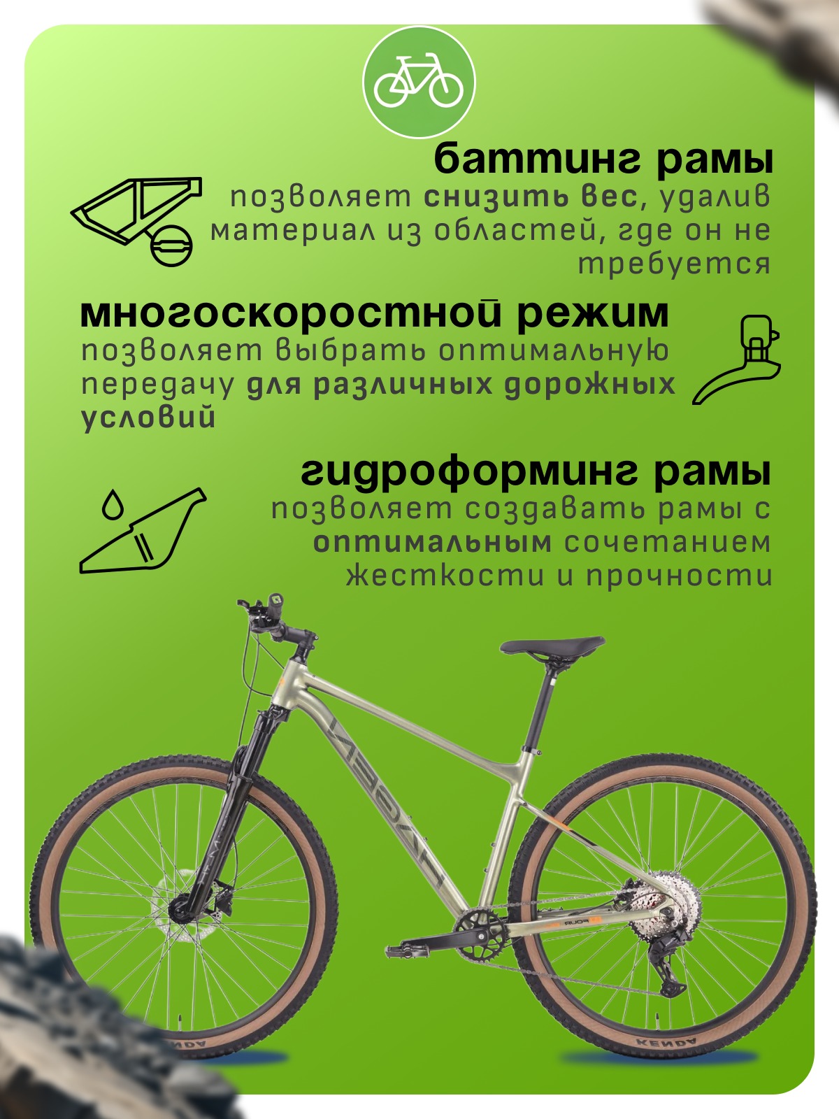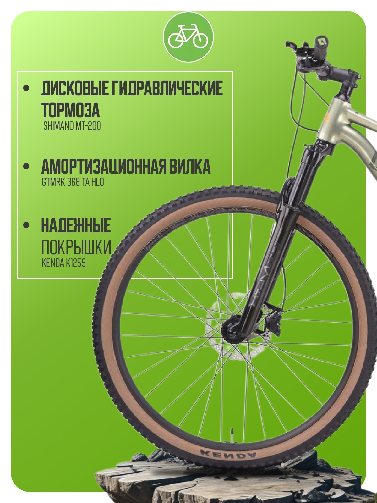 Горный велосипед с оборудованием начального любительского класса Shimano, 8 скоростей. Технические особенности: легкая алюминиевая рама (полая ось Boost, бесшовная, конусный стакан, полная внутренняя проводка), амортизационная вилка GTMRK 368 TA HLO (пружинно-масляная, полая ось Boost 15х110 мм, ход 100 мм, черная анодировка), двойные алюминиевые обода (ширина 27 мм, под ниппель Presta F/V 48 мм), дисковые гидравлические тормоза Shimano MT-200 (роторы 180/160 мм). Подходит для активной езды по различным дорогам и пересеченной местности. Диаметр колес - 27,5 дюймов. Вес - 14,5 кг (для размера 18 М).