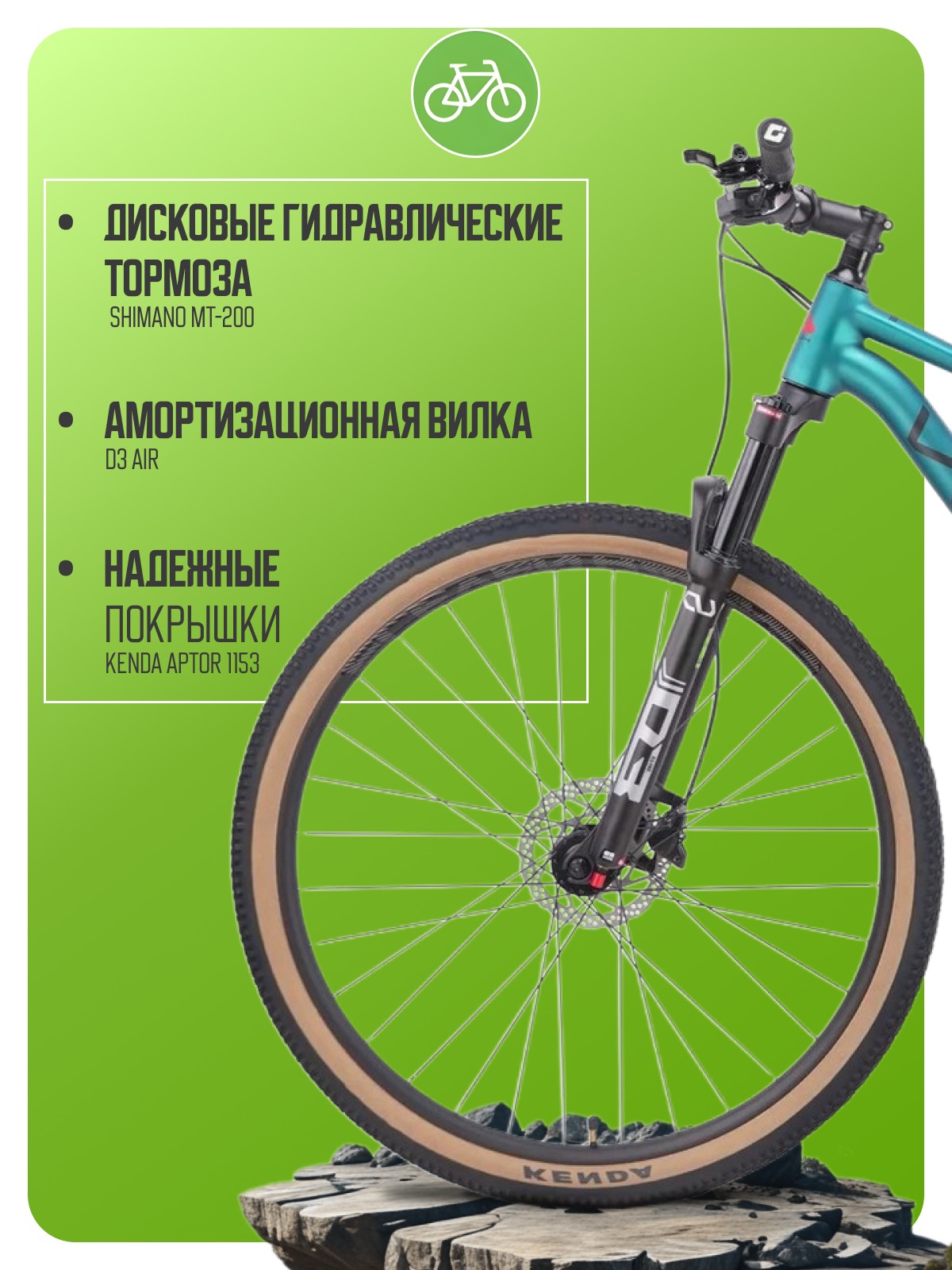 Горный велосипед с оборудованием любительского класса Microshift, 10 скоростей. Технические особенности: легкая алюминиевая рама (сглаженные швы, внутренняя проводка, конический рулевой стакан), амортизационная вилка D3 Air (воздушная, ход 100 мм, алюминиевые ноги диаметром 30 мм, магниевые штаны, черная анодировка, гидравлическая блокировка, регулировка отскока), двойные алюминиевые обода DP-27 (под ниппель AV, ширина 27 мм), дисковые гидравлические Shimano MT-200 (роторы 160/160 мм). Подходит для активной езды по различным дорогам и пересеченной местности. Диаметр колес - 27,5 дюймов. Вес - 13,4 кг (для размера 18 M).