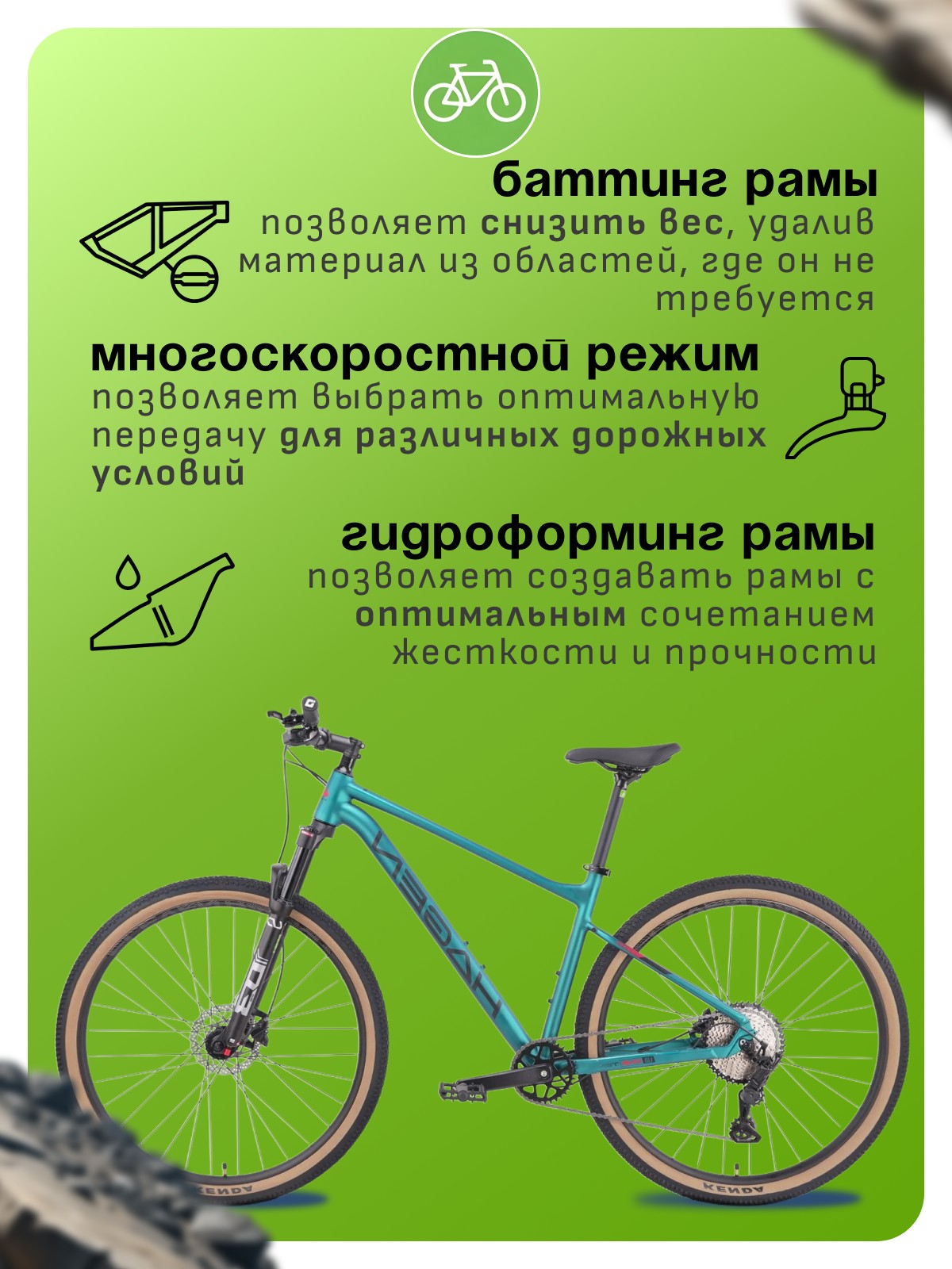 Особенности велосипеда: Алюминиевая рама, Амортизационная вилка, Баттинг рамы, Гидравлический привод тормозов, Гидроформинг рамы, Двойные обода, Дисковые тормоза, Масляная или воздушная вилка, Многоскоростной.