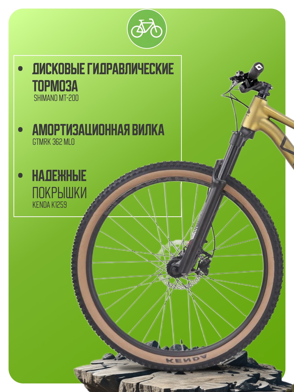 Горный велосипед с оборудованием начального любительского класса Shimano, 8 скоростей. Технические особенности: легкая алюминиевая рама (бесшовная, конусный стакан, полная внутренняя проводка, спорт геометрия), амортизационная вилка GTMRK 362 MLO (пружинно-эластомерная, блокировка хода, регулировка преднагрузки, ход 120 мм, черная анодировка), двойные алюминиевые обода (ширина 27 мм, под ниппель Presta F/V 48 мм), дисковые гидравлические тормоза Shimano MT-200 (роторы 180/160 мм). Подходит для активной езды по различным дорогам и пересеченной местности. Диаметр колес - 29 дюймов. Вес - 14,7 кг (для размера 18 L).