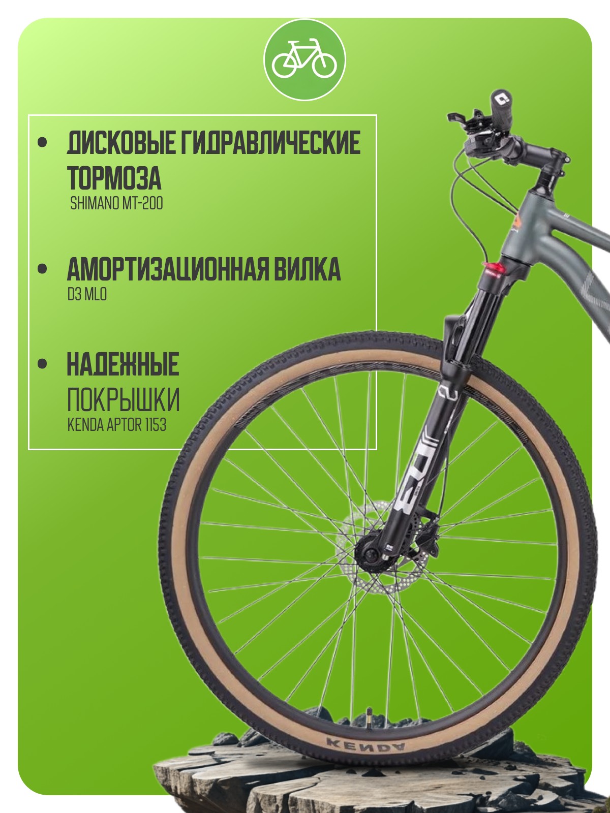 Горный велосипед с оборудованием любительского класса Microshift, 9 скоростей. Технические особенности: легкая алюминиевая рама (сглаженные швы, внутренняя проводка, конический рулевой стакан), амортизационная вилка D3 MLO (пружинно-эластомерная, ход 120 мм, механическая блокировка, регулировка преднагрузки, диаметр ног 30 мм, черная анодировка), двойные алюминиевые обода DP-27 (под ниппель AV, ширина 27 мм), дисковые гидравлические Shimano MT-200 (роторы 160/160 мм). Подходит для активной езды по различным дорогам и пересеченной местности. Диаметр колес - 29 дюймов. Вес - 15,1 кг (для размера 20 XL).