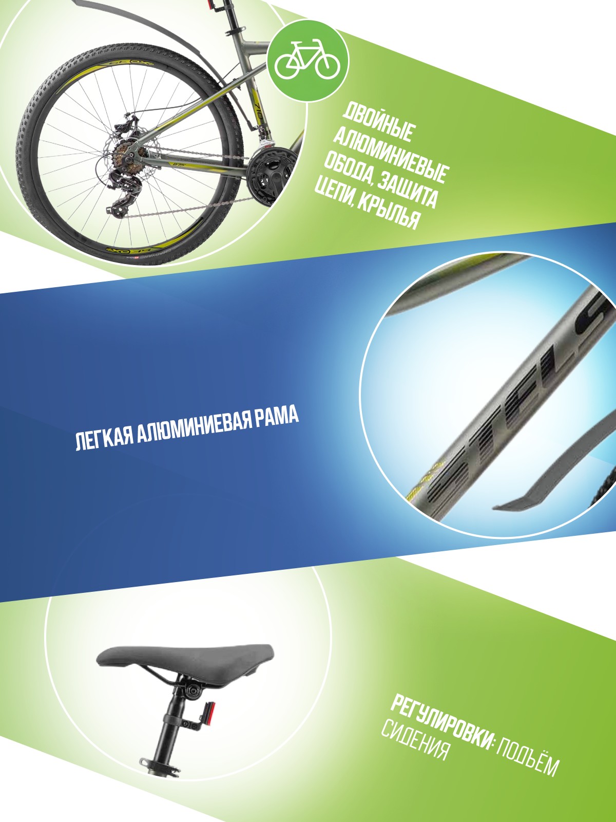 Особенности велосипеда: Алюминиевая рама, Амортизационная вилка, Двойные обода, Дисковые тормоза, Защита цепи, Катафоты, Крылья, Многоскоростной, Подножка.