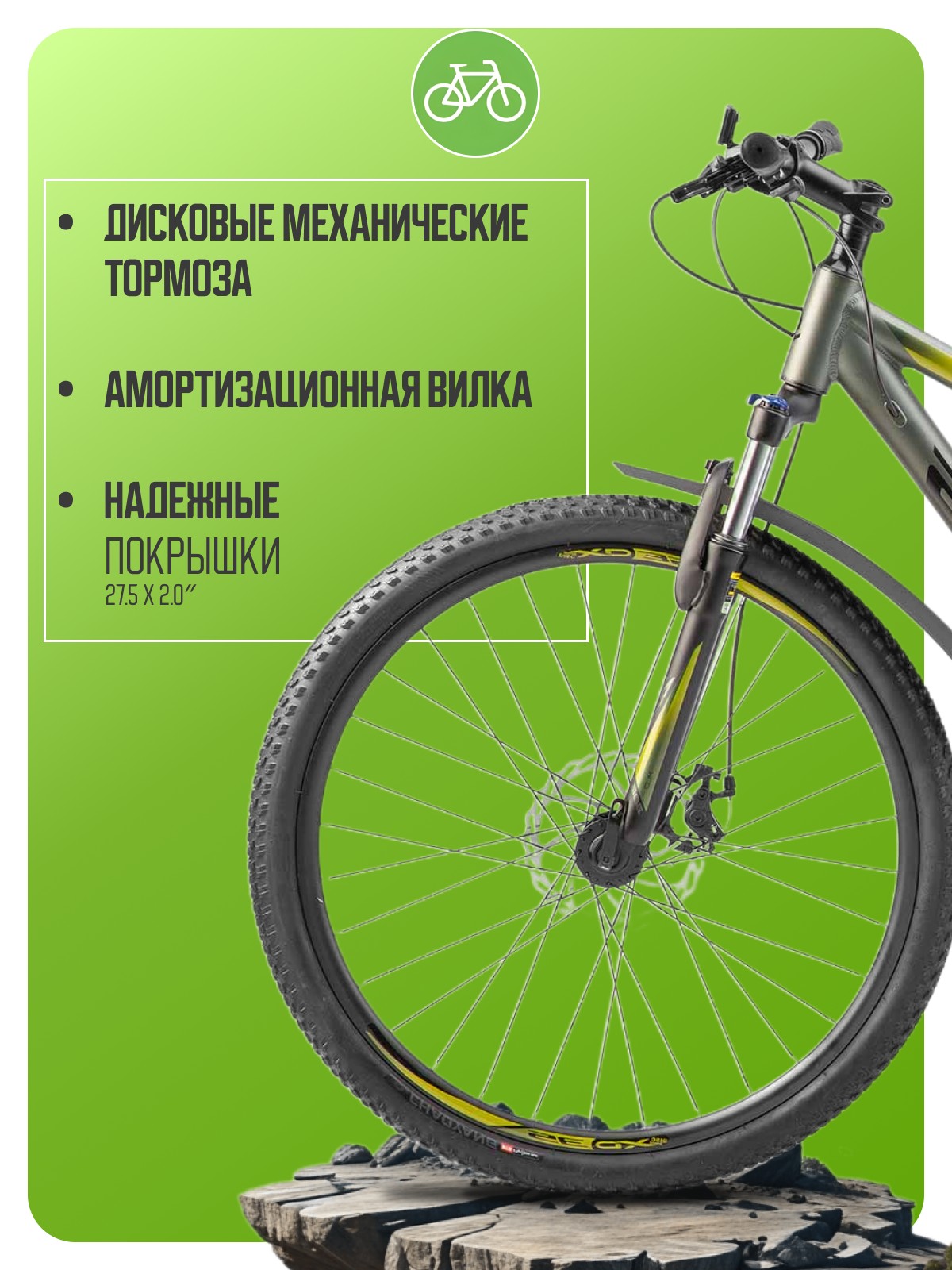 Горный велосипед для начинающих с навесным оборудованием Shimano, 21 скорость. Технические особенности: легкая алюминиевая рама (частично скрытая прокладка тросов, кареточный стакан BSA), амортизационная вилка (пружинно-эластомерная, стальная с алюминиевой короной, ход 80 мм, крепление калипера IS), двойные алюминиевые обода (под AV ниппель), дисковые механические тормоза (роторы 180/160 мм, 6 болтов), подножка, катафоты, крылья. Подходит для прогулочной езды по различным дорогам и пересеченной местности. Диаметр колес - 27,5 дюймов. Вес - 16 кг.