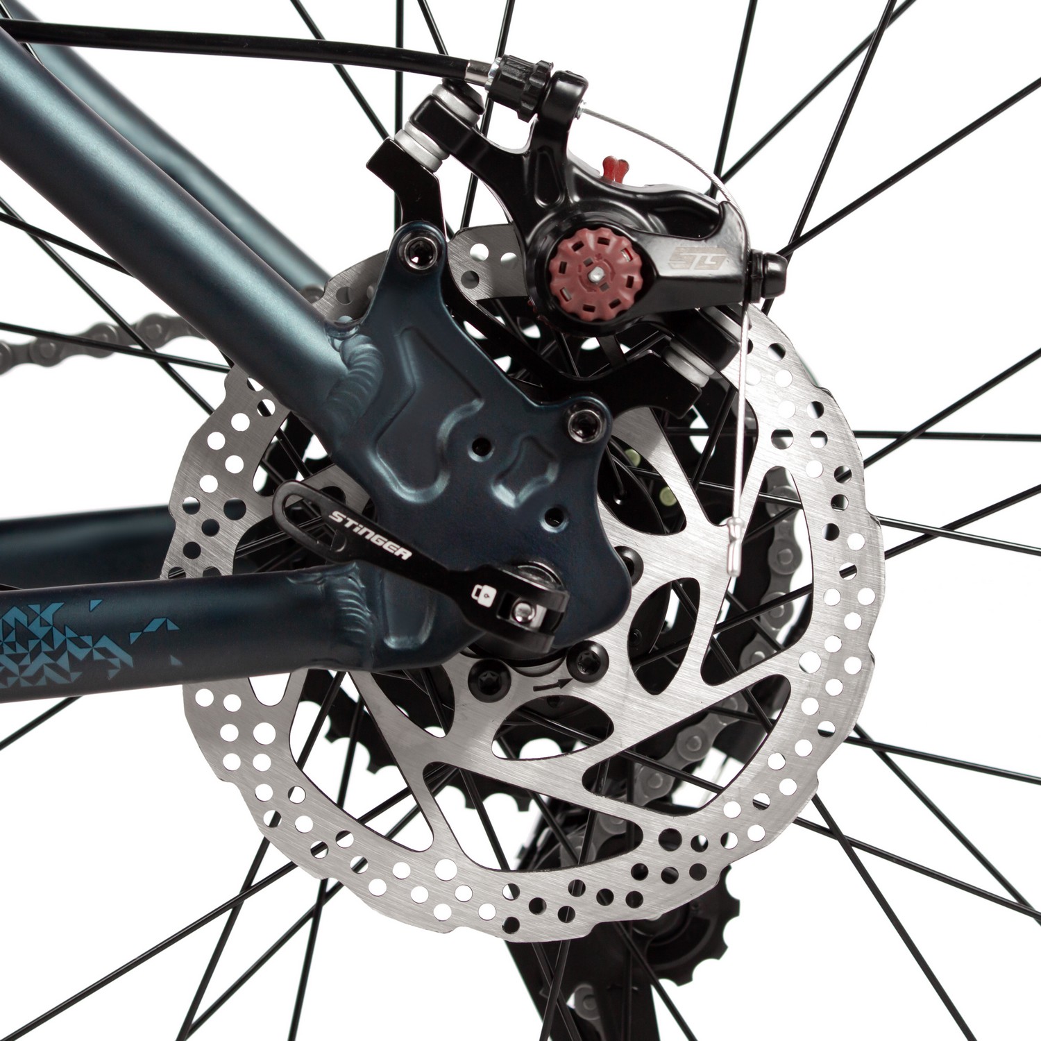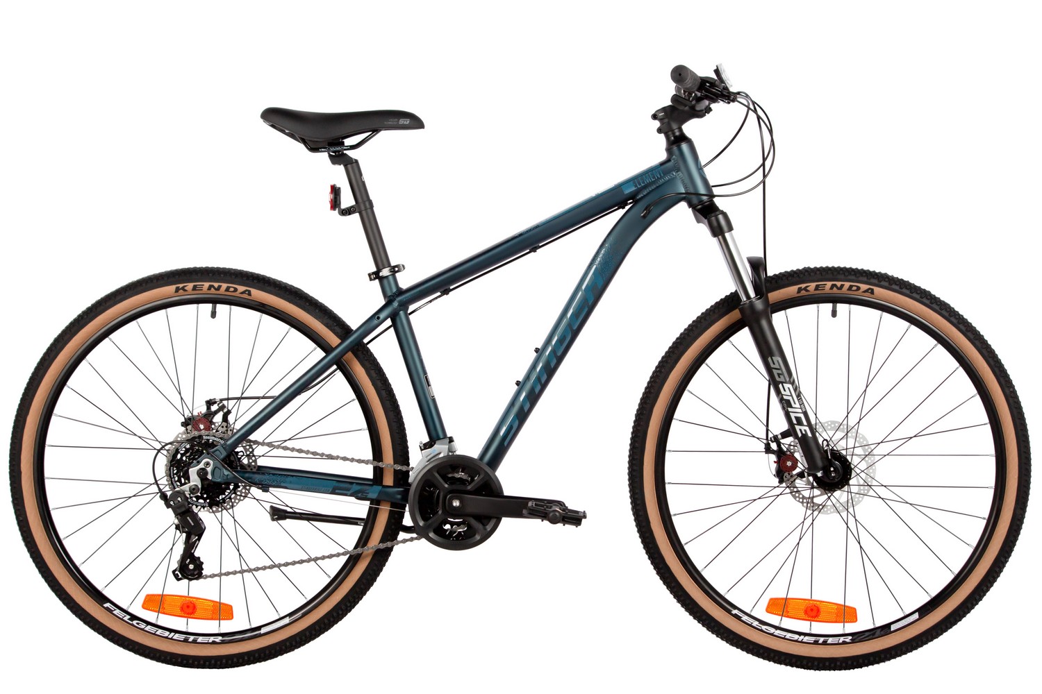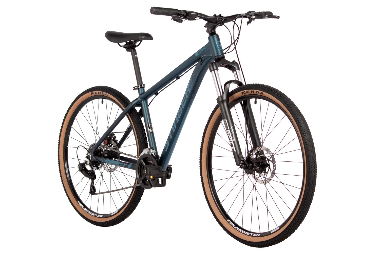 Горный велосипед с оборудованием начального класса Shimano, 14 скоростей. Технические особенности: легкая алюминиевая рама (сплав 6061-T6, полуинтегрированная рулевая колонка, кареточный стакан BSA, частично скрытая прокладка тросов, съёмный петух), амортизационная вилка STG Spice (пружинная, ход 110 мм, регулировка преднатяга пружины), двойные алюминиевые обода Felgebeiter VB-18 (под AV ниппель), дисковые механические тормоза STG (роторы 160/160 мм с креплением на 6 болтов), защита цепи, подножка. Подходит для активной езды по различным дорогам и пересеченной местности. Диаметр колес - 27,5 дюймов. Вес - 15,1 кг.
