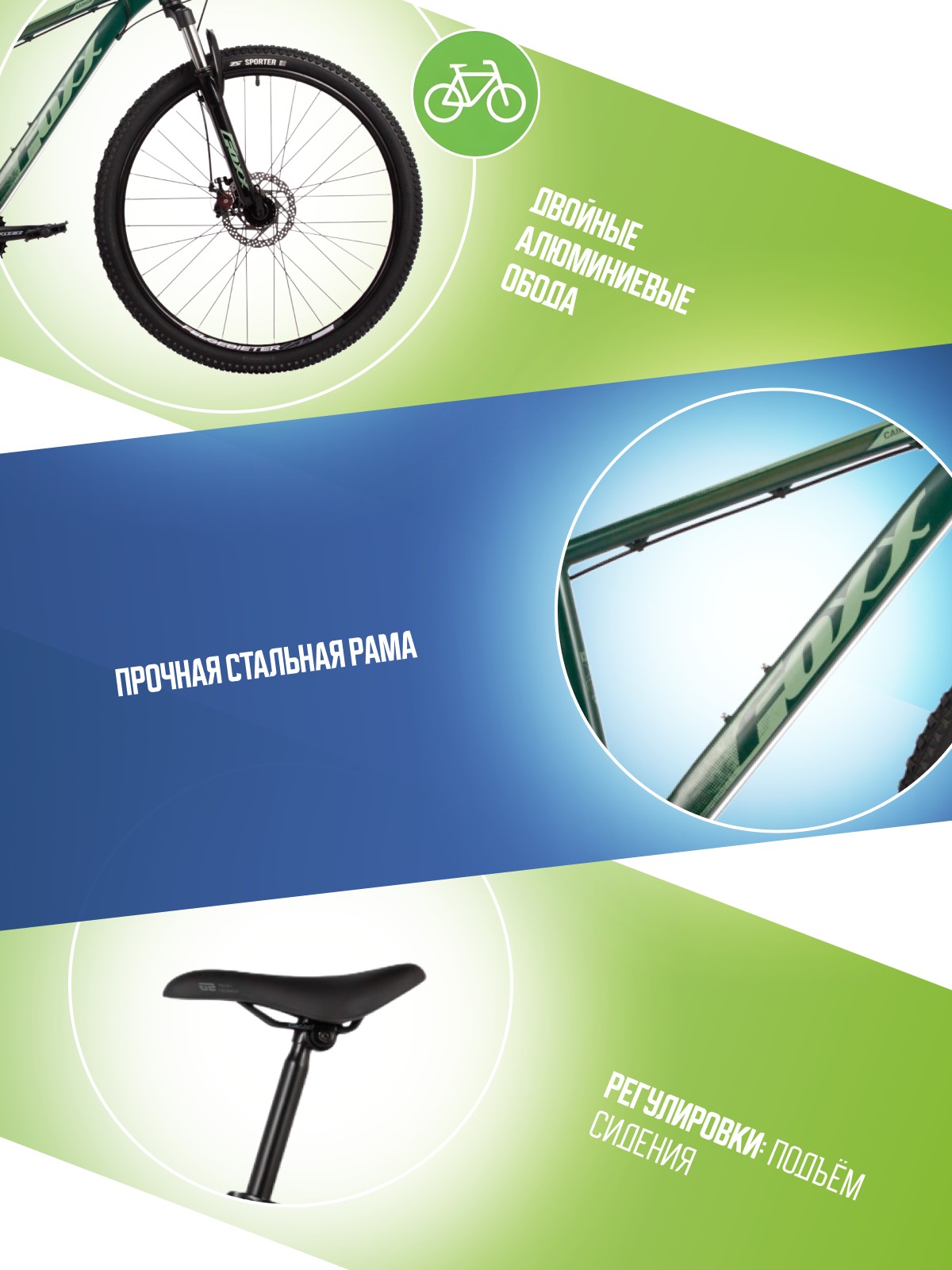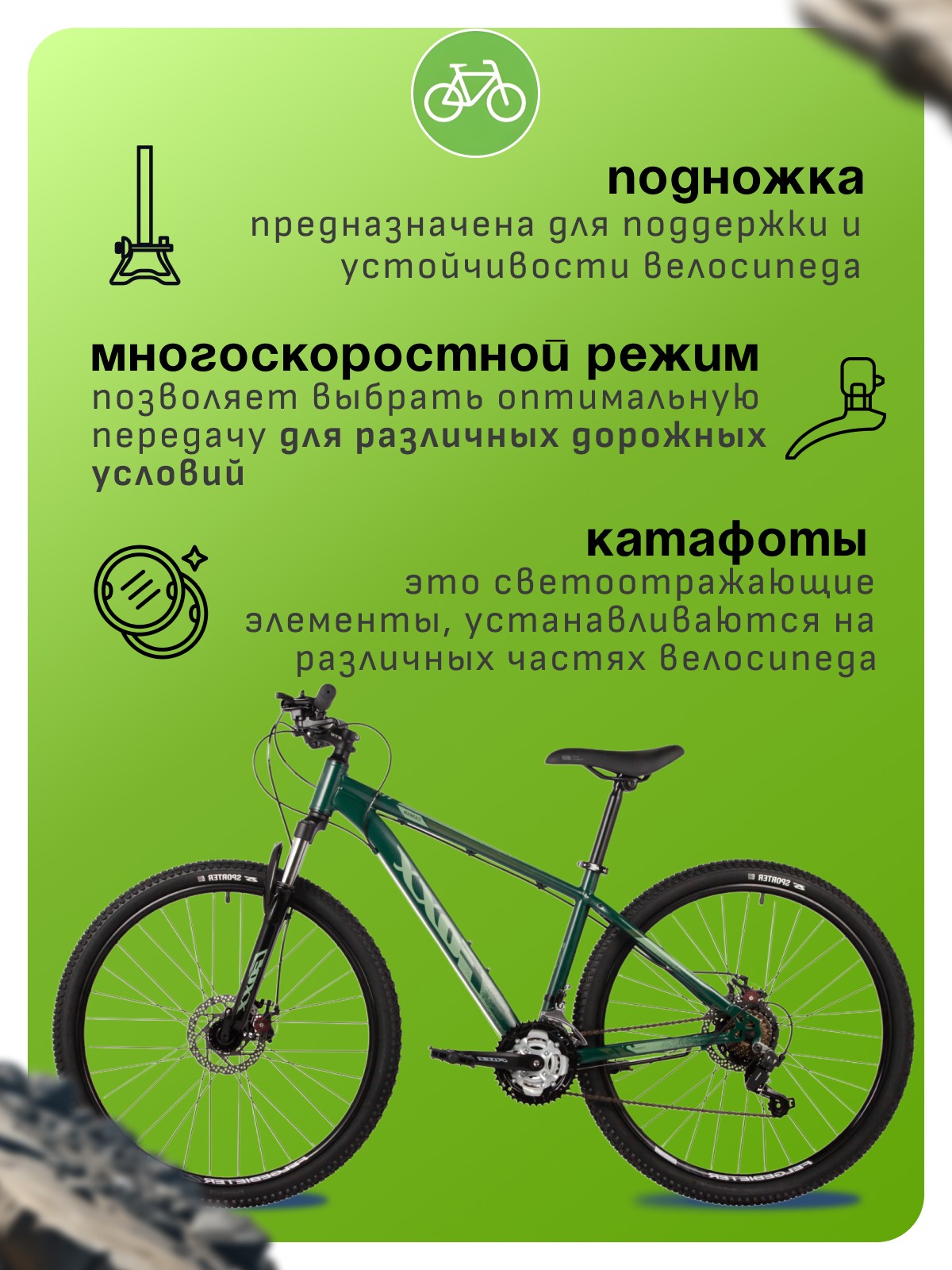 Особенности велосипеда: Амортизационная вилка, Двойные обода, Дисковые тормоза, Катафоты, Многоскоростной, Подножка.