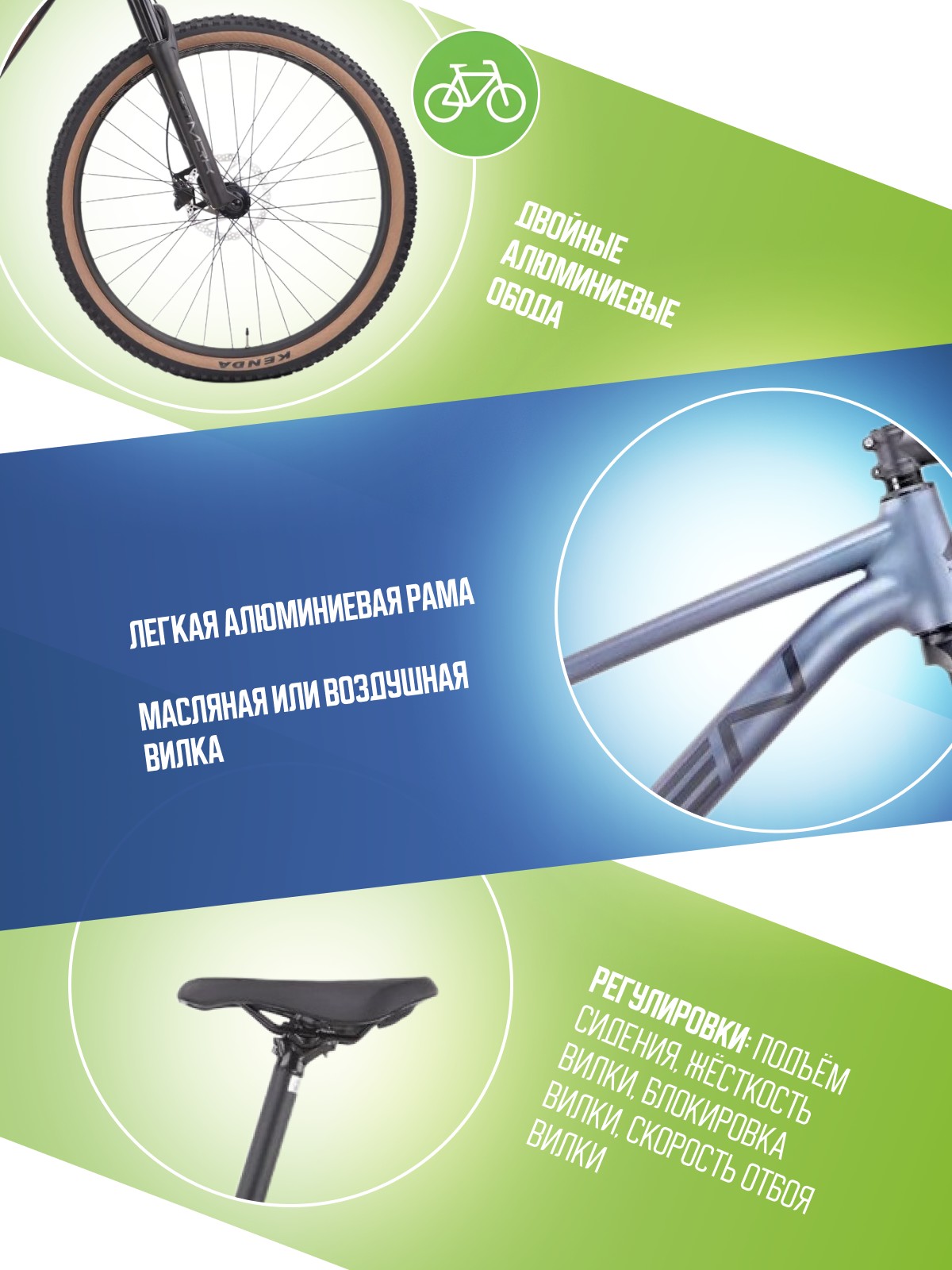 Регулировки и настройки: Блокировка вилки, Жесткость вилки, Подьем сидения, Скорость отбоя вилки.