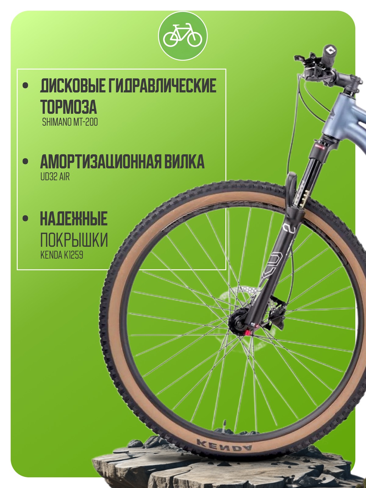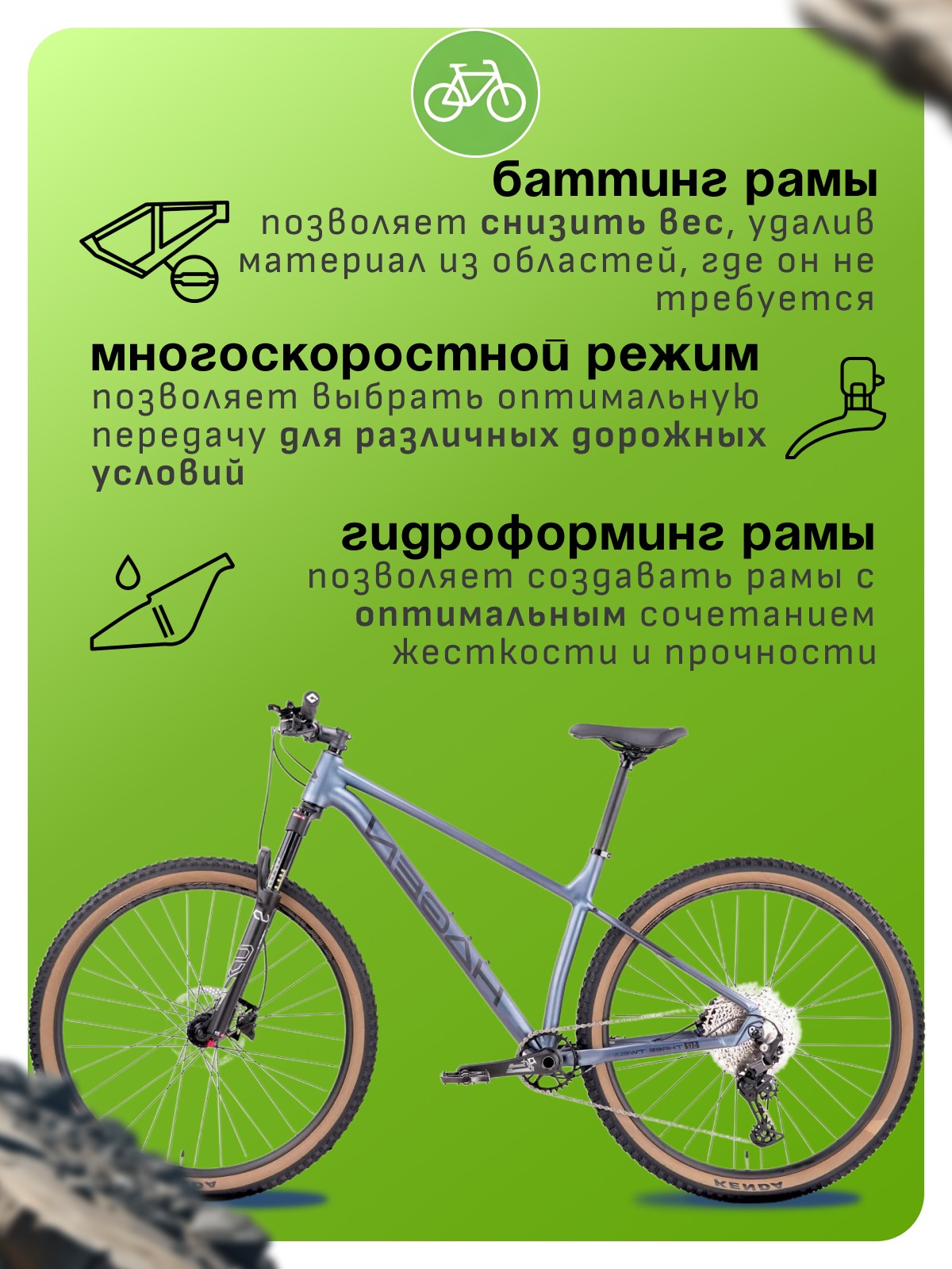Особенности велосипеда: Алюминиевая рама, Амортизационная вилка, Баттинг рамы, Гидравлический привод тормозов, Гидроформинг рамы, Двойные обода, Дисковые тормоза, Масляная или воздушная вилка, Многоскоростной.