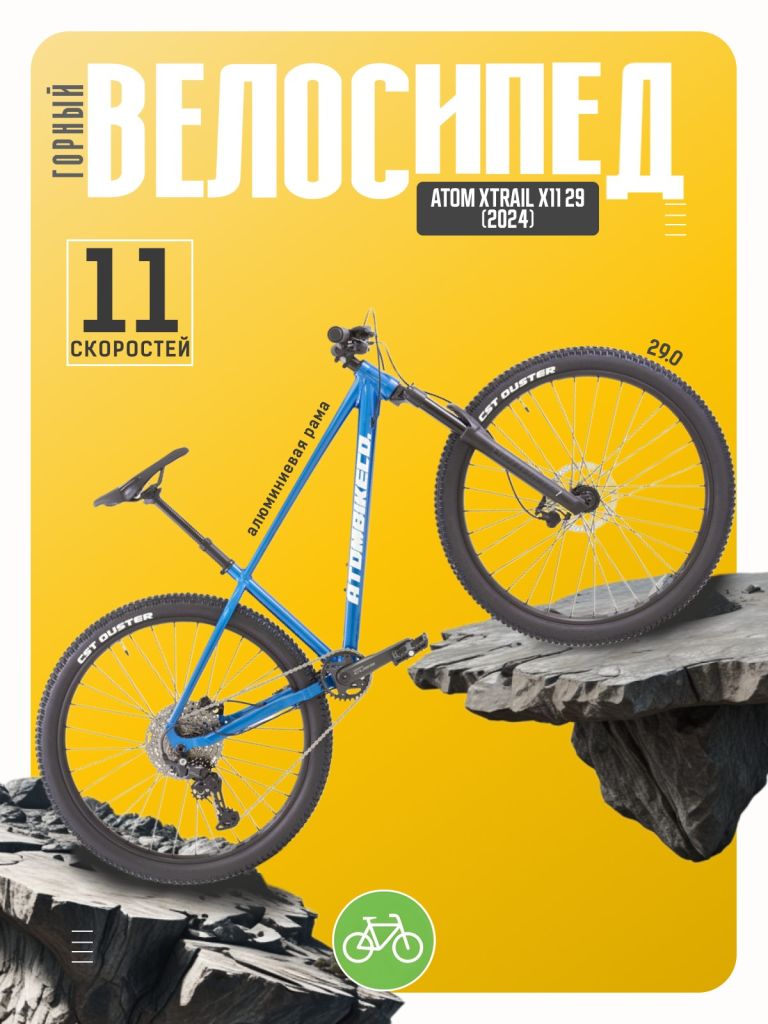 Горный велосипед с навесным оборудованием предпрофессионального класса Shimano, 11 скоростей. Технические особенности: алюминиевая рама Alloy 6061-T6 Triple Butted (тройной баттинг, внутренняя проводка, дропауты под полую ось), амортизационная вилка ATOM Radium 34 HLO (масляно-пружинная, ход 120 мм, гидравлическая блокировка), двойные алюминиевые обода WTB STX i30, дисковые гидравлические тормоза Tektro HD-M275 (роторы Tektro TR-24 180/180 мм). Подходит для активного катания в стиле трейл и кросс-кантри. Диаметр колес - 29 дюймов. Вес - 14,9 кг.