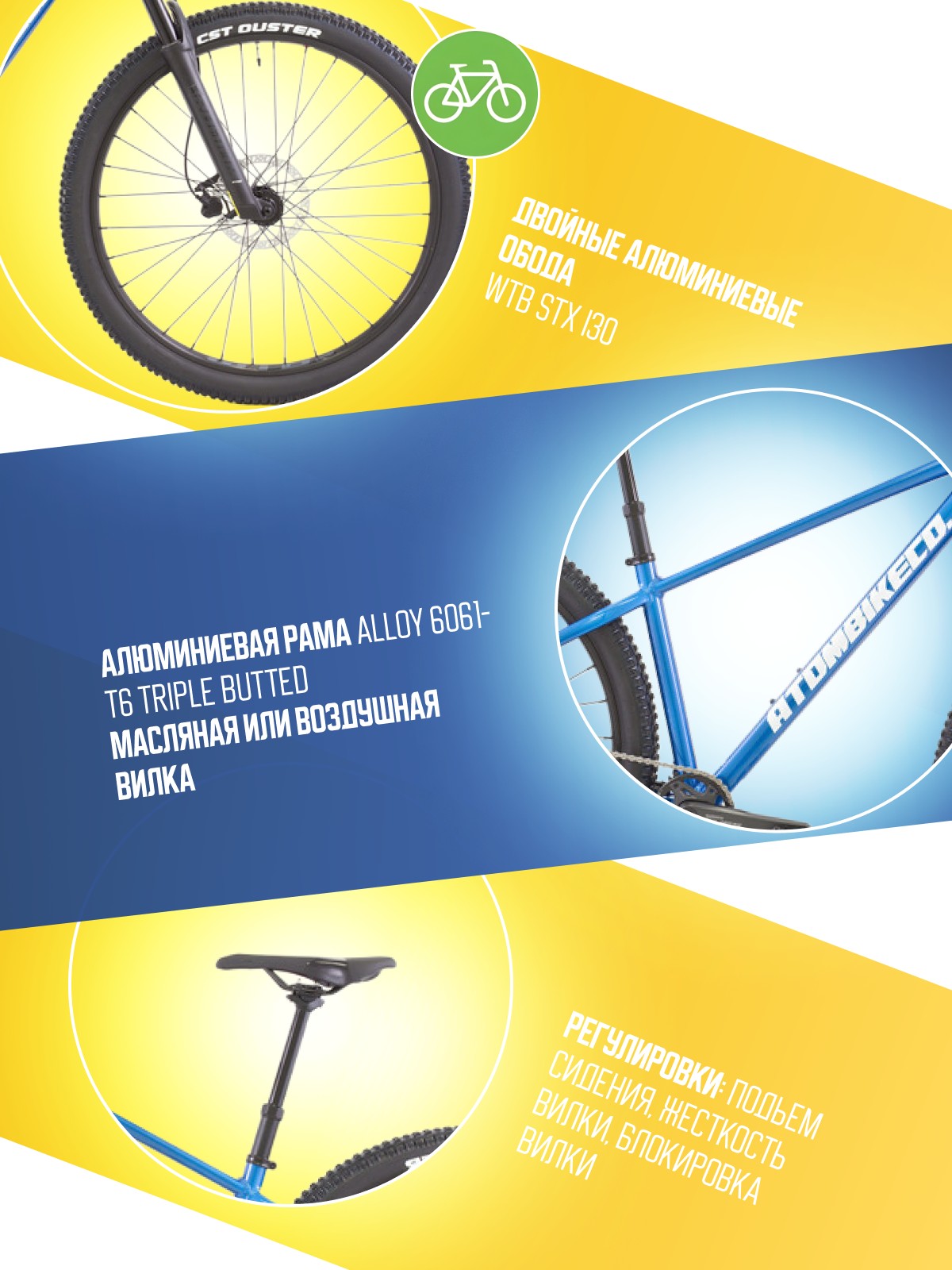 Особенности велосипеда: Алюминиевая рама, Амортизационная вилка, Баттинг рамы, Гидравлический привод тормозов, Гидроформинг рамы, Двойные обода, Дисковые тормоза, Масляная или воздушная вилка, Многоскоростной.