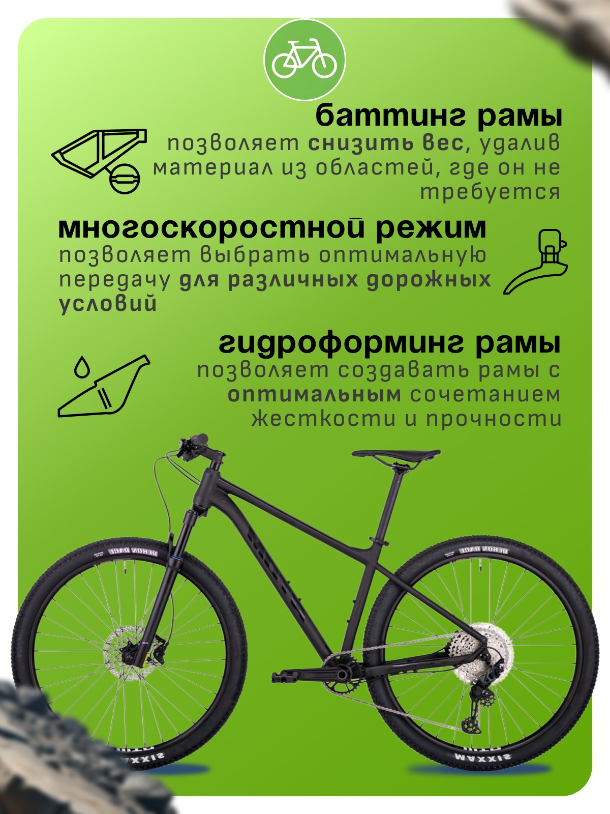 Легкий хардтейл для езды в стиле кросс-кантри с оборудованием предпрофессионального класса Shimano, 12 скоростей. Технические особенности: легкая алюминиевая рама ATOM B9 TFS Alloy Triple Butted RaceLite 6061 (тройной баттинг, скрытая проводка, конический рулевой стакан), амортизационная вилка ATOM Radium 32 Air (воздушная, гидравлическая блокировка, ход 100 мм), двойные алюминиевые обода WTB SXi23 (подходят для бескамерного использования), дисковые гидравлические тормоза Shimano BR-MT400 (роторы Shimano SM-RT30 Centerlock 180/160 мм). Подходит для активного катания в стиле кросс-кантри. Диаметр колес - 29 дюймов. Вес - 13,5 кг.