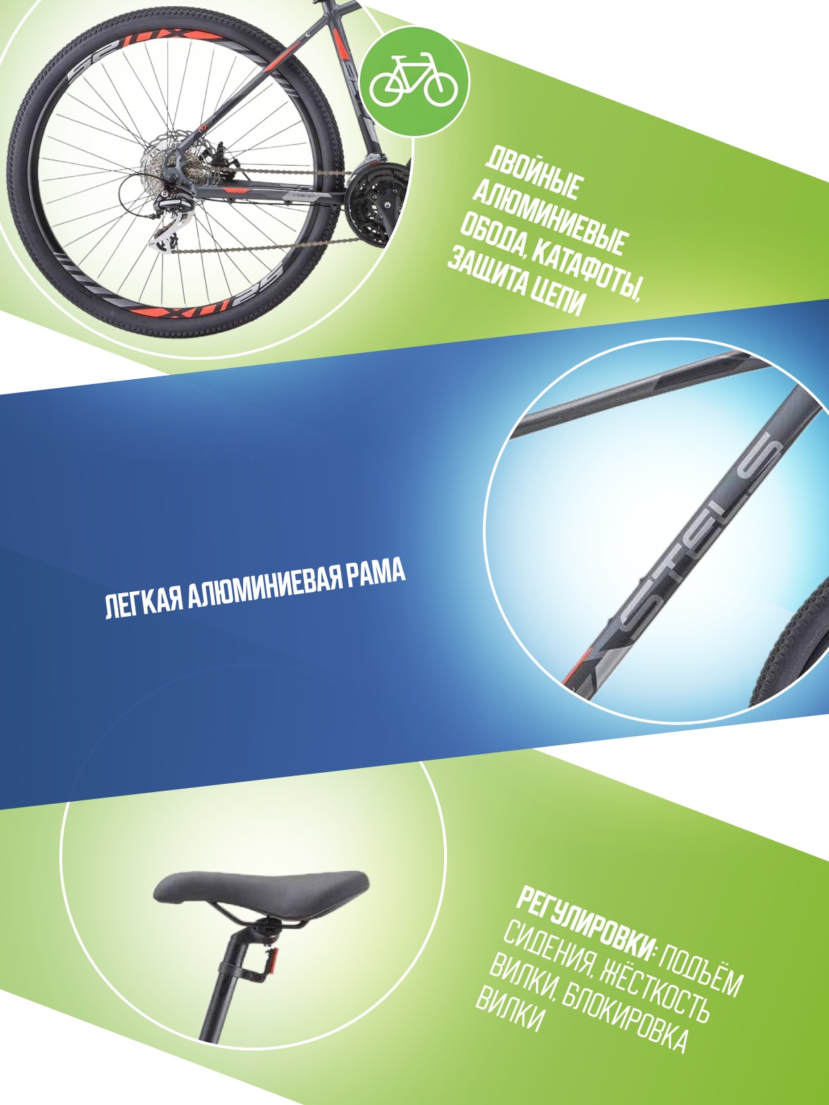 Особенности велосипеда: Алюминиевая рама, Амортизационная вилка, Баттинг рамы, Гидроформинг рамы, Двойные обода, Дисковые тормоза, Защита цепи, Катафоты, Многоскоростной.