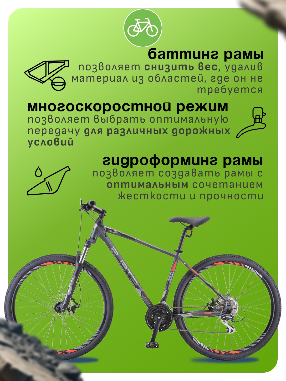 Горный велосипед с навесным оборудованием Shimano, 24 скорости. Технические особенности: легкая алюминиевая рама (сплав 6061, гидроформинг, 3D дропаут, крепление калипера внутри перьев, скрытая прокладка тросов, съемный петух, кареточный стакан BSA, рулевой стакан ZS, крепление калипера PM), амортизационная вилка Suntour XCM32 HLO (пружинно-масляная, ход 100 мм, регулировка преднатяга и блокировка, крепление калипера PM), дисковые механические тормоза (роторы 180/160 мм), защита цепи, катафоты. Подходит для активной езды по различным дорогам и пересеченной местности. Диаметр колес - 29 дюймов. Вес - 15,68 кг.