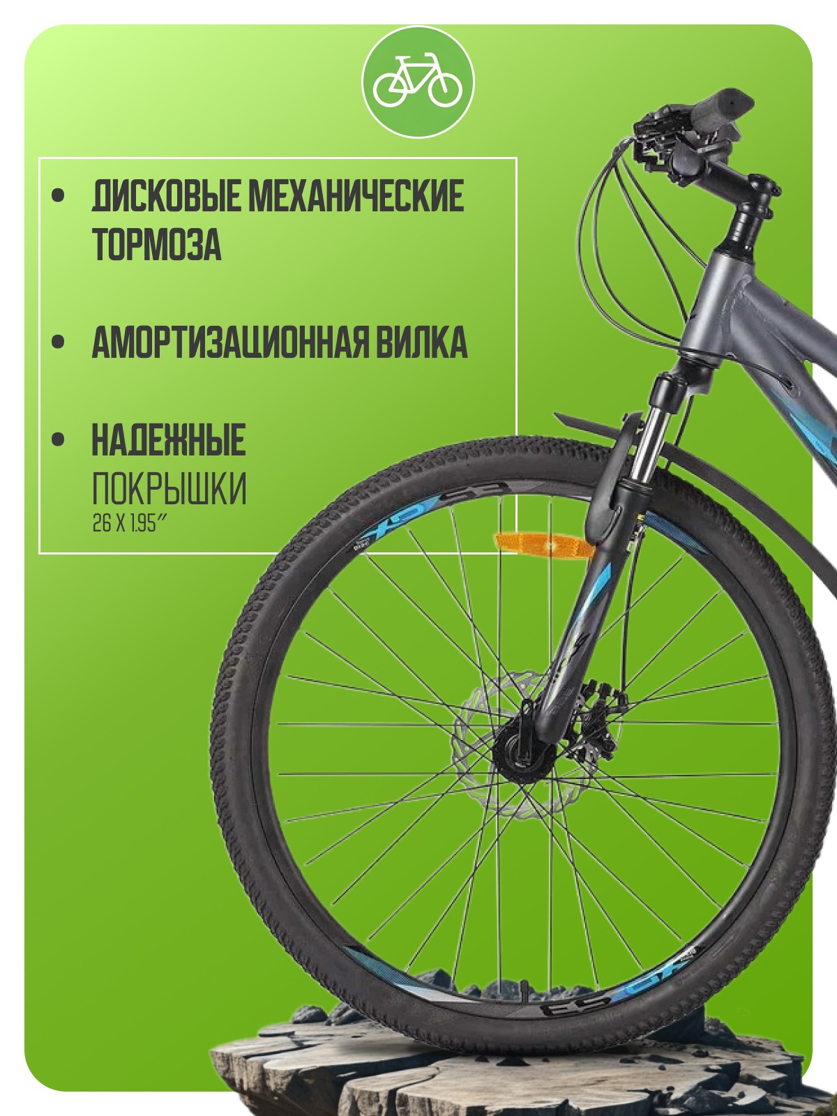 Горный велосипед для начинающих с навесным оборудованием Shimano, 21 скорость. Технические особенности: алюминиевая рама, амортизационная вилка (пружинная, ход 60 мм), двойные алюминиевые обода, дисковые механические тормоза (роторы 160/160 мм), подножка, катафоты, крылья. Подходит для прогулочной езды по различным дорогам и пересеченной местности. Диаметр колес - 26 дюймов. Вес - 15,98 кг.