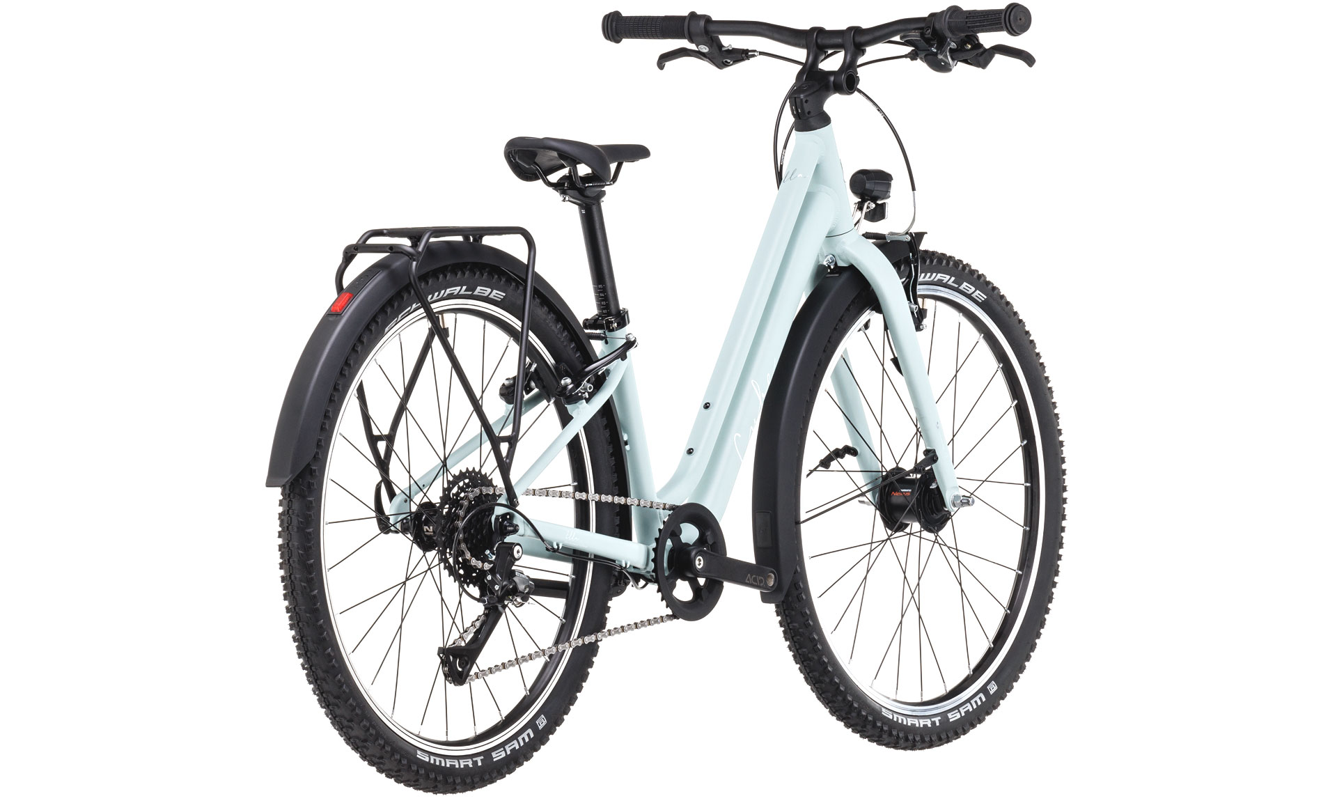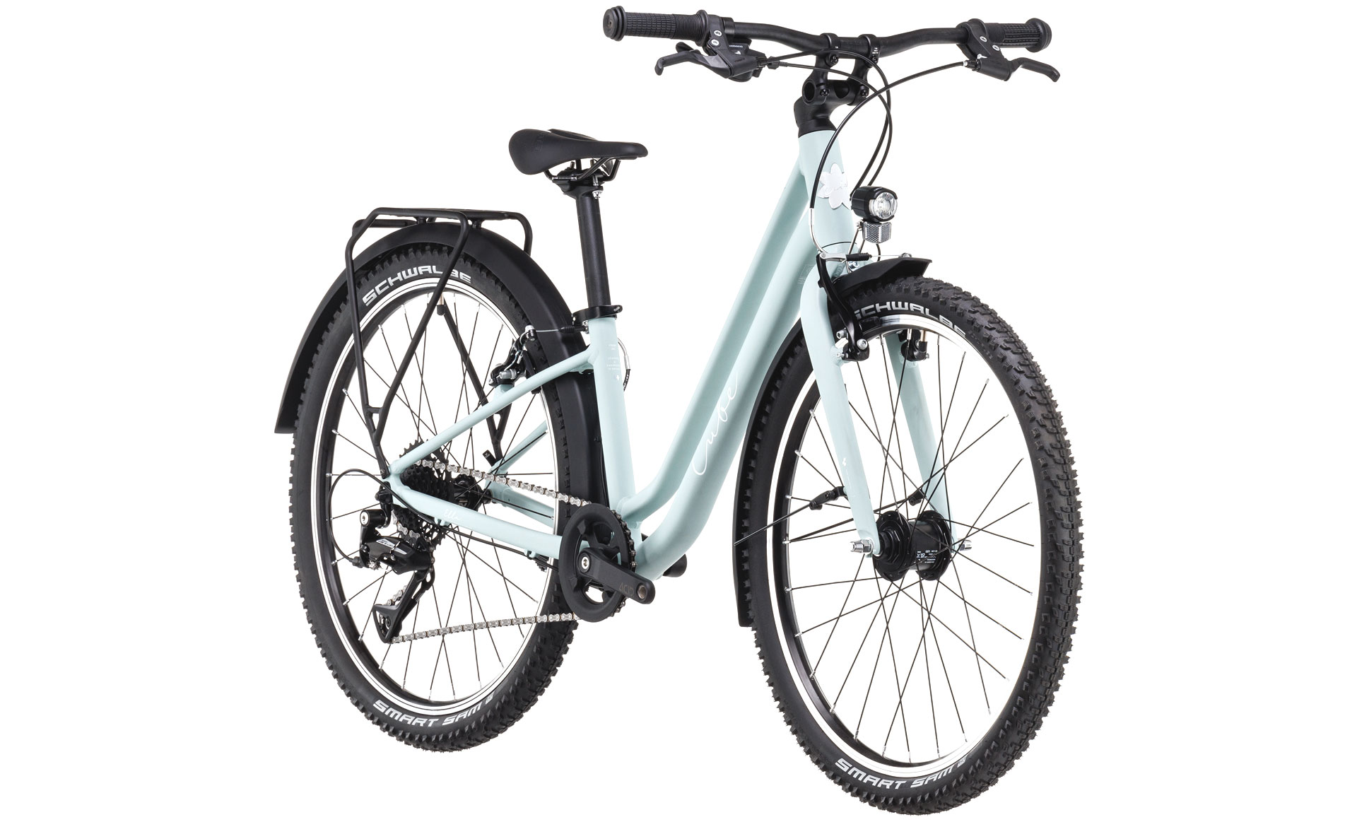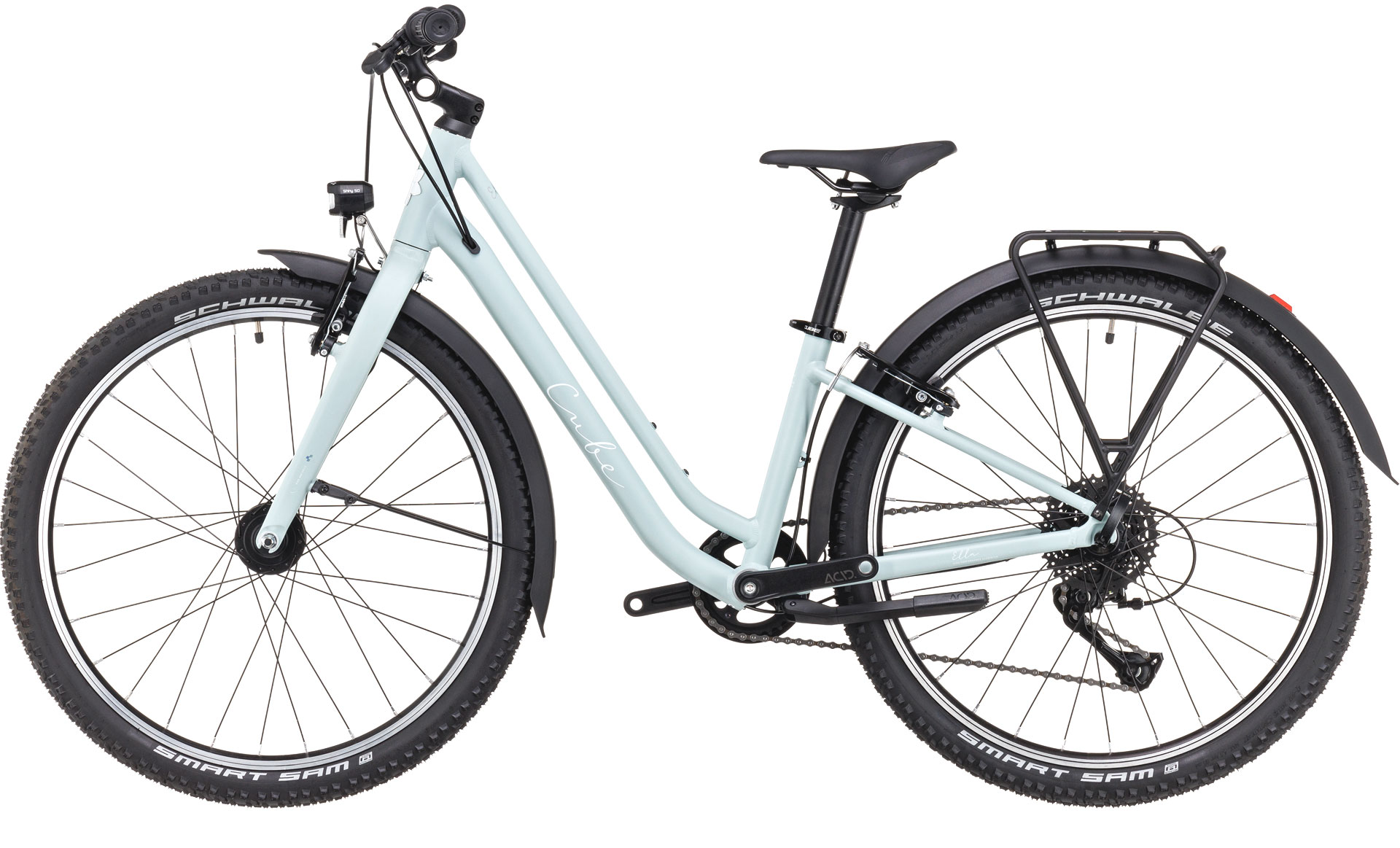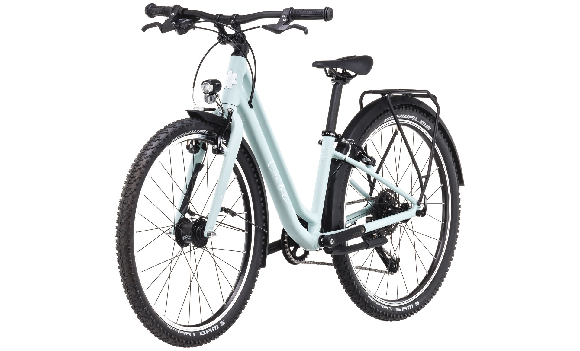 Подростковый велосипед для девочек с оборудованием любительского класса Shimano, 8 скоростей. Технические особенности: легкая алюминиевая рама (сплав 6061, гидроформинг, двойной баттинг, скрытая проводка, прямой рулевой стакан, кареточный стакан BSA), жесткая алюминиевая вилка (сплав 6061), двойные алюминиевые обода CUBE ACE17 (под ниппель AV), надежные ободные тормоза Alloy V-Brake (алюминиевые рычаги), регулируемый вынос CUBE Numove adjustable, защита цепи, динамо-втулка Shimano DH-T4000-1N, передний фонарь CUBE Shiny 50, задний фонарь ACID Mudguard Rear Light PRO-D, подножка ACID FM Rookie, полноразмерные крылья ACID Rookie 55, задний багажник ACID Rookie. Подходит для комфортного катания по городским улицам и по несложным маршрутам в лесу. Диаметр колес - 24 дюйма. Вес - 10,6 кг.