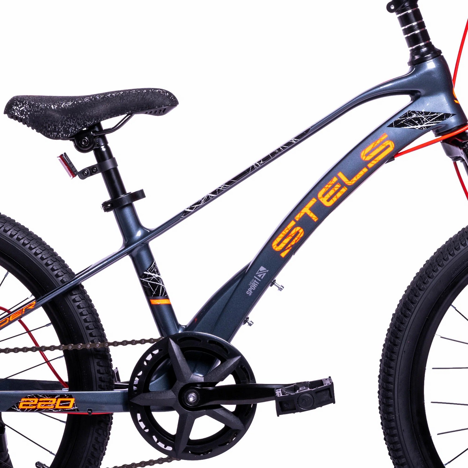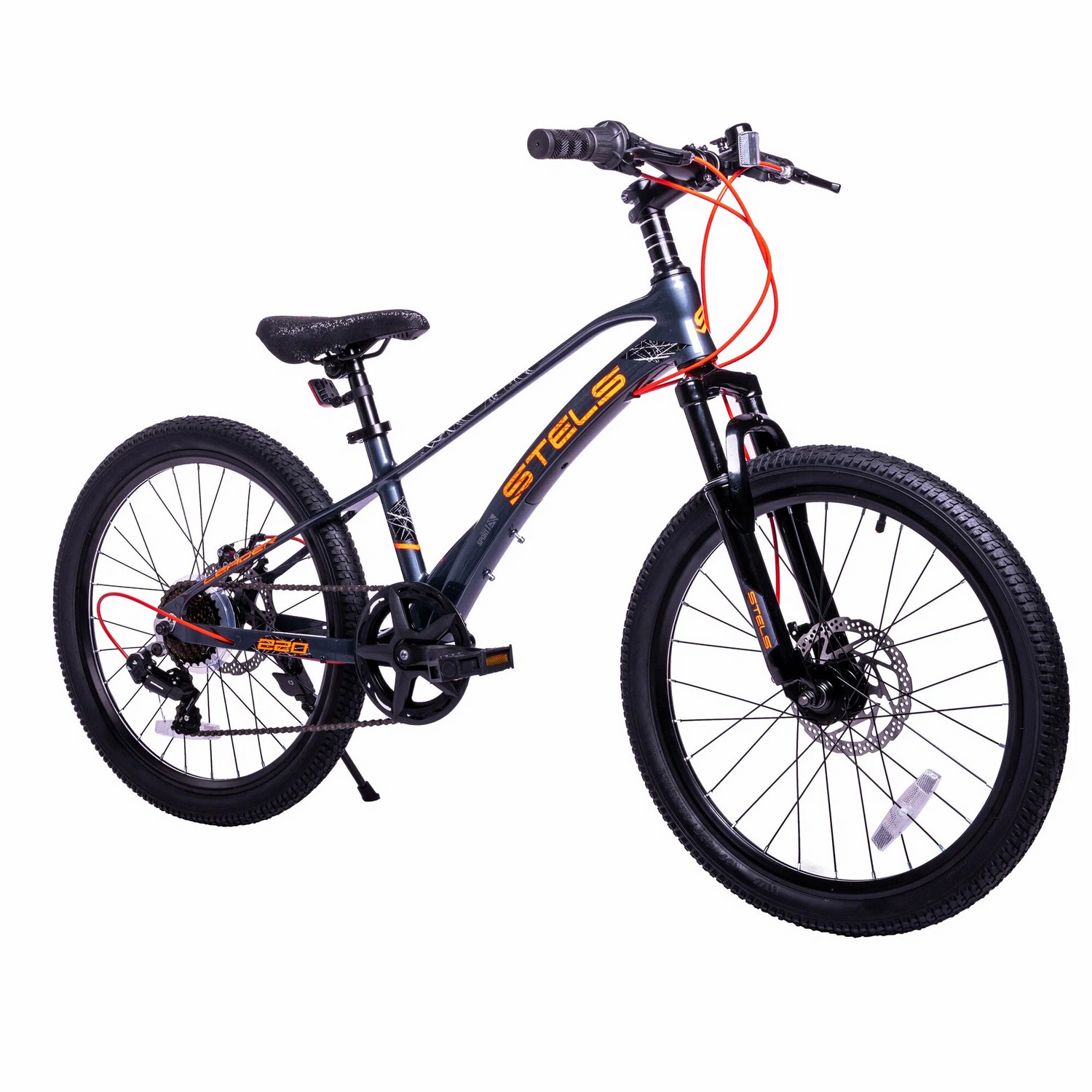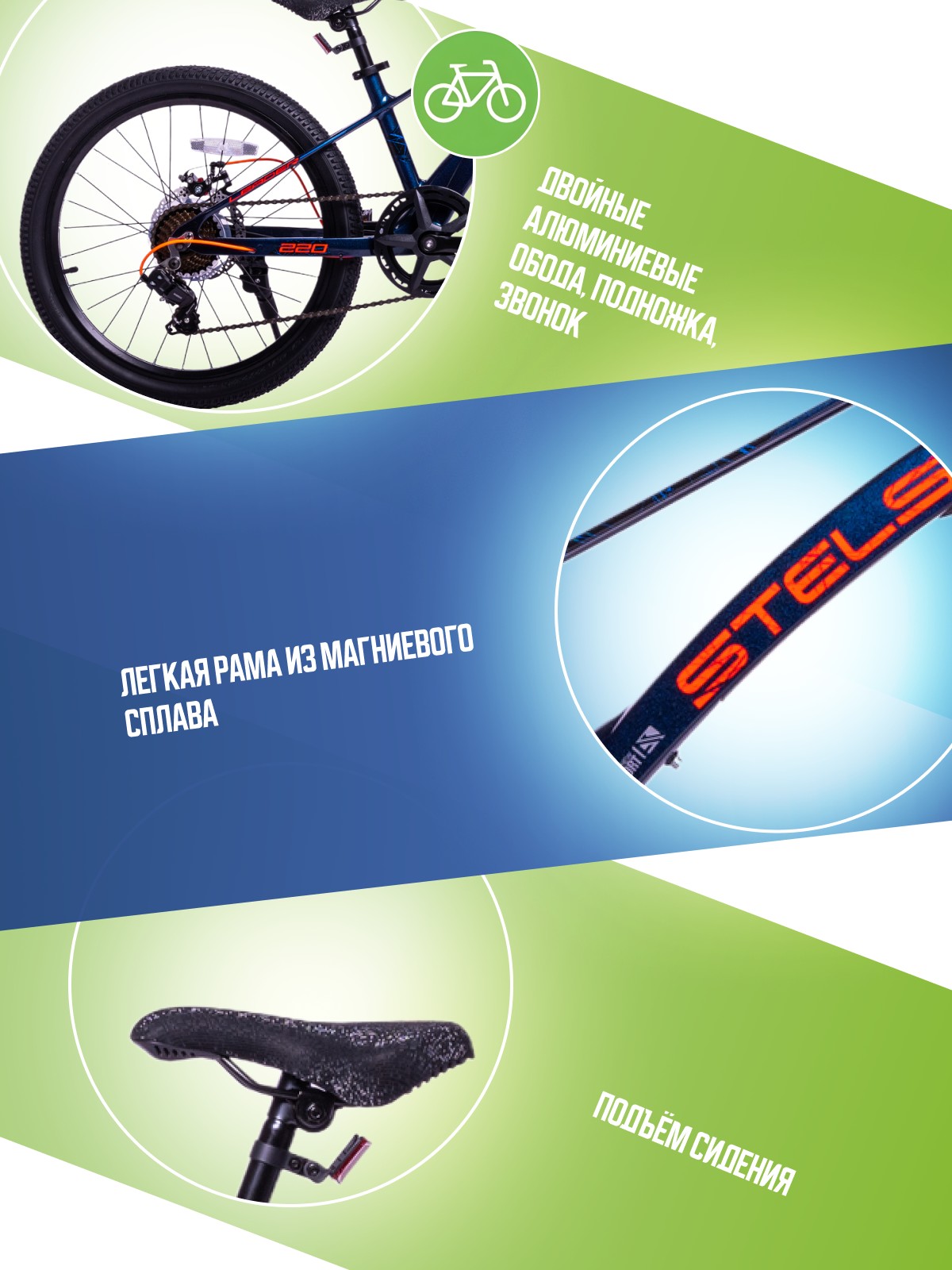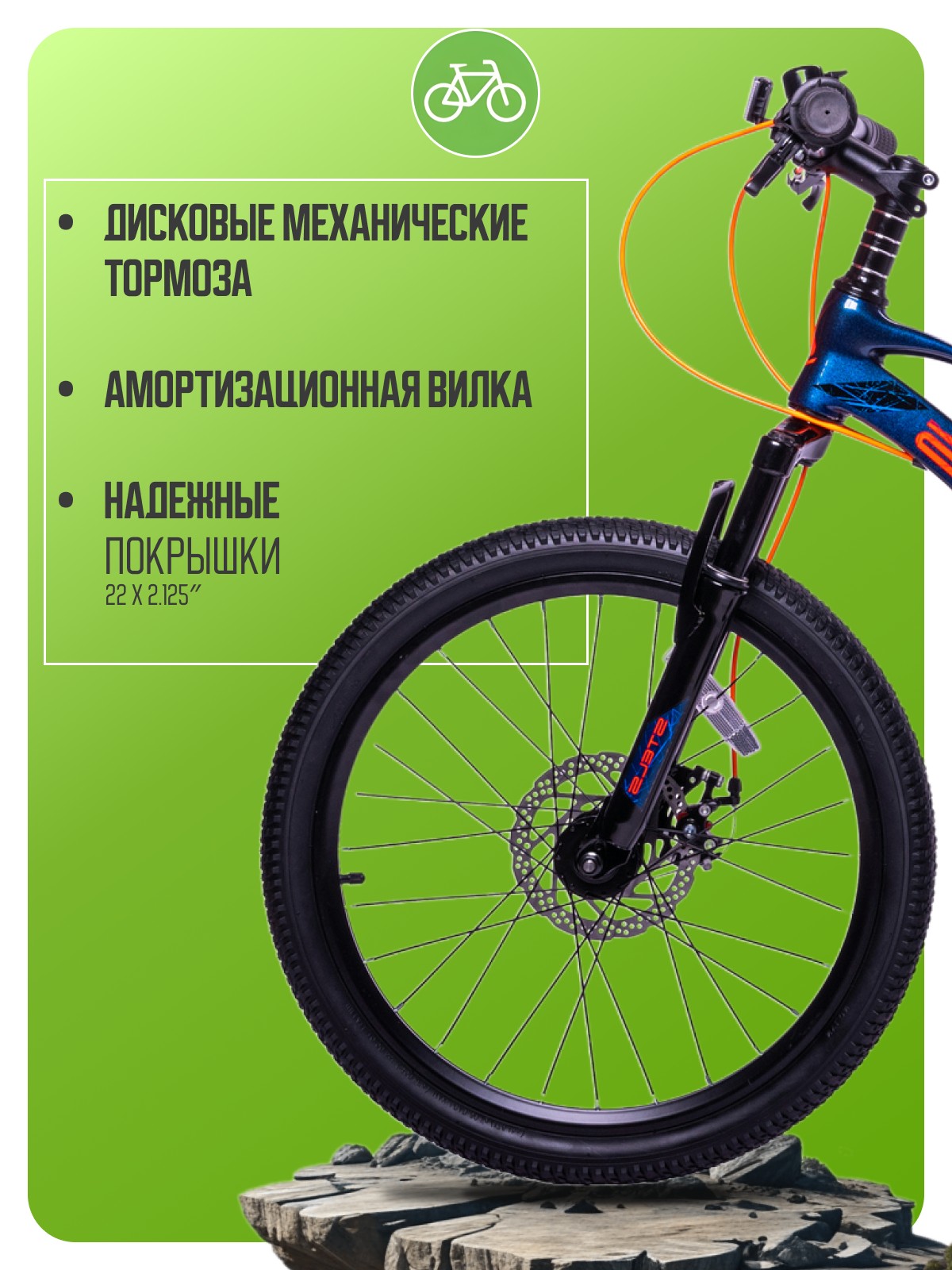 Велосипед, предназначенный для детей в возрасте от пяти до девяти лет, с оборудованием начального класса Shimano, 7 скоростей. Технические особенности: легкая рама из магниевого сплава, амортизационная вилка, двойные алюминиевые обода (под ниппель AV), дисковые механические тормоза (роторы 160/160 мм), защита цепи, катафоты, звонок, подножка. Подходит для прогулочного катания в городских условиях и по несложным маршрутам в лесу. Диаметр колес - 22 дюйма. Вес - 11 кг.