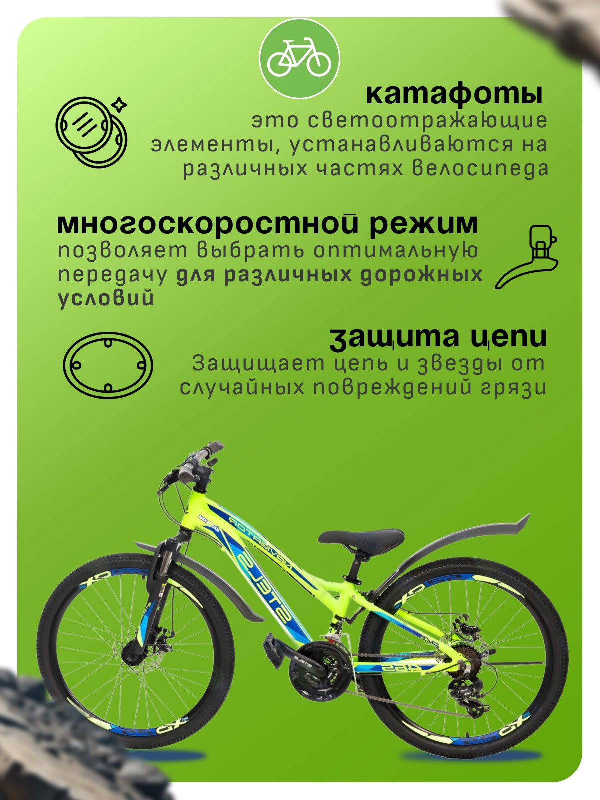 Особенности велосипеда: Алюминиевая рама, Амортизационная вилка, Двойные обода, Дисковые тормоза, Защита цепи, Катафоты, Многоскоростной, Подножка.