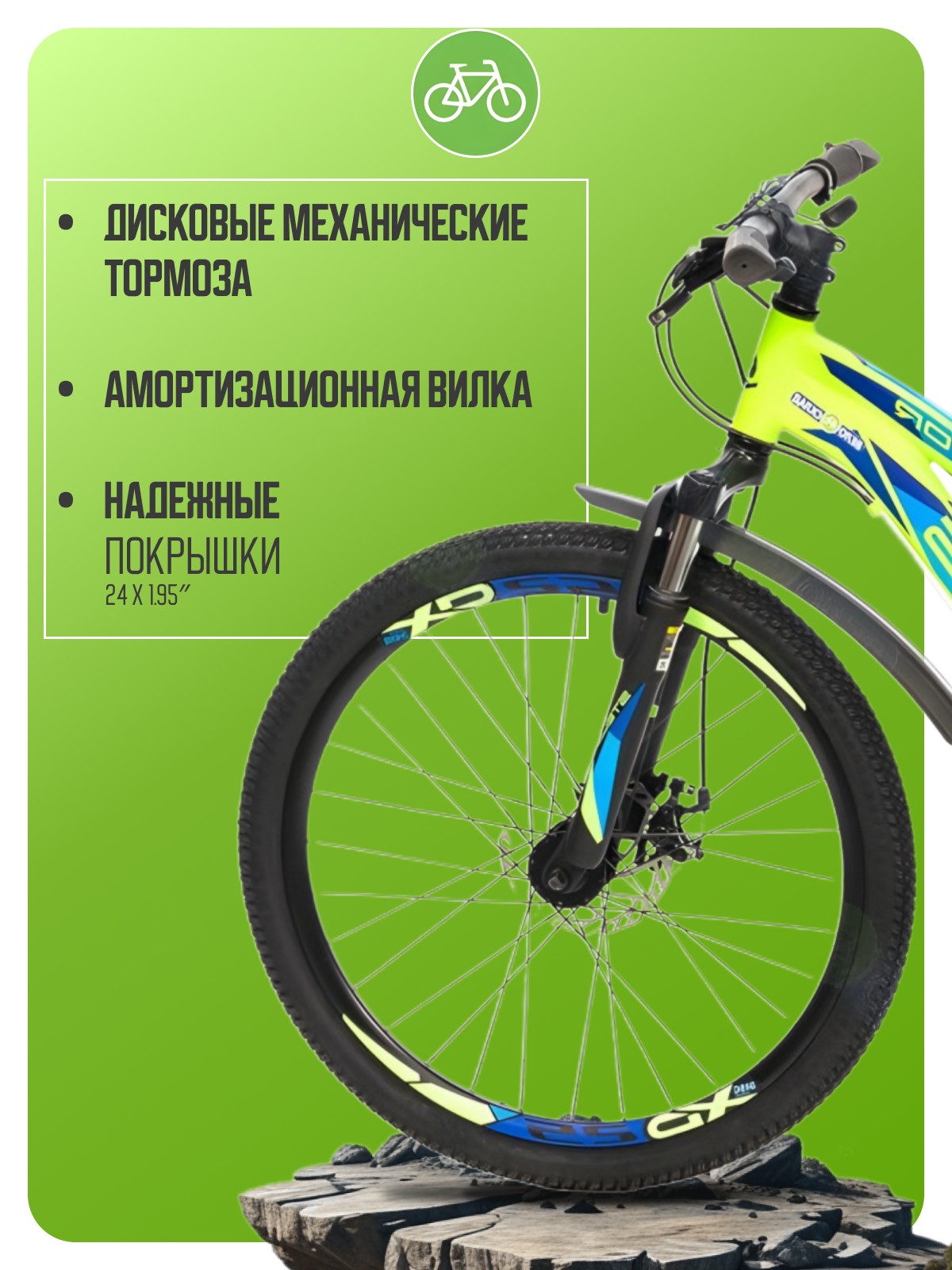 Велосипед, предназначенный для детей в возрасте от восьми до тринадцати лет, с оборудованием начального класса Shimano, 21 скорость. Технические особенности: легкая алюминиевая рама, амортизационная вилка (ход 50 мм), двойные алюминиевые обода, дисковые механические тормоза (роторы 160/160 мм), защита цепи, катафоты, подножка. Подходит для прогулочного катания в городских условиях и по несложным маршрутам в лесу. Диаметр колес - 24 дюйма. Вес - 14,5 кг.