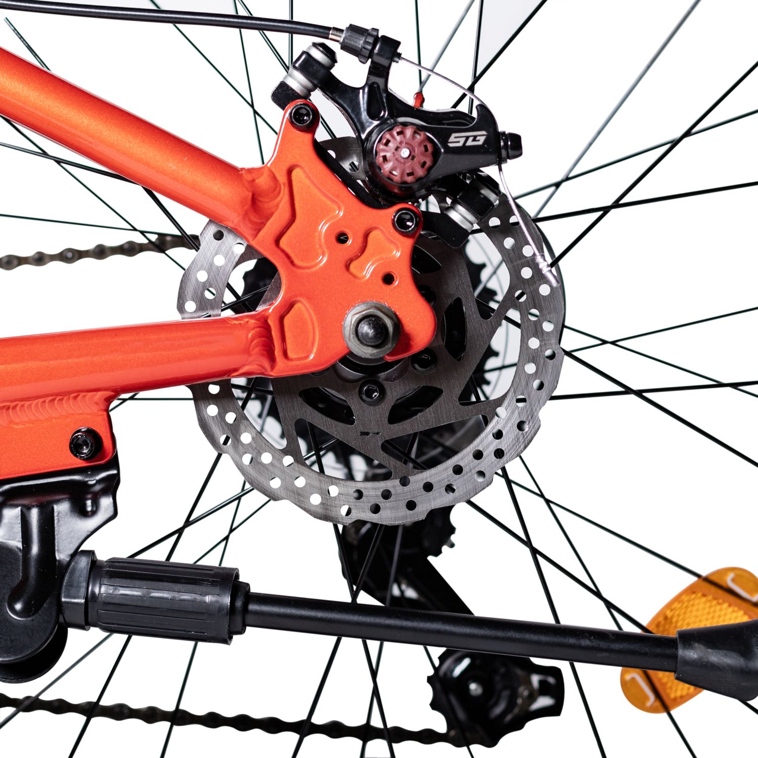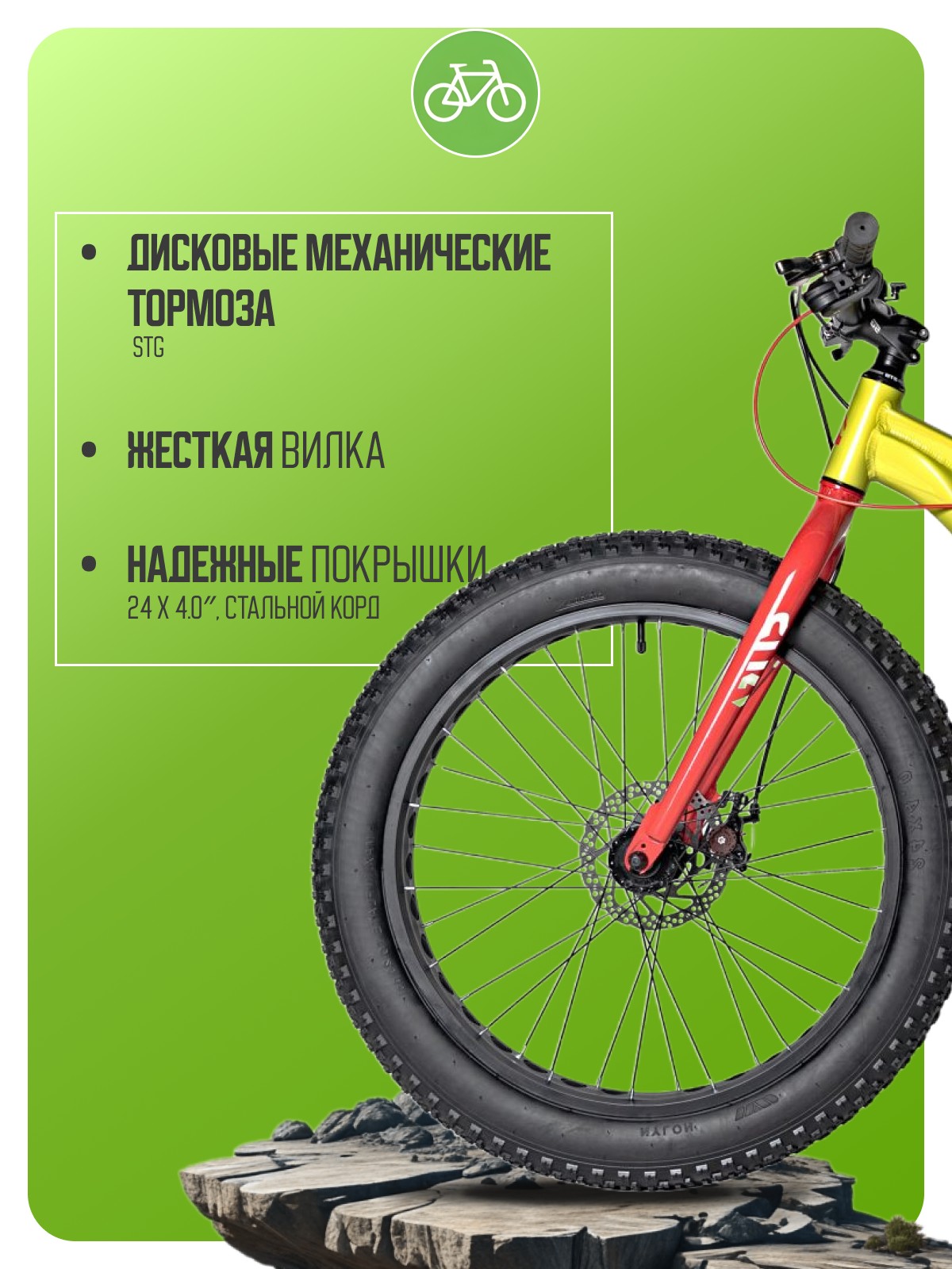 Велосипед, предназначенный для детей в возрасте от восьми до тринадцати лет, с оборудованием начального класса Shimano, 7 скоростей. Технические особенности: алюминиевая рама (сплав 6061, открытая прокладка тросов, съемный петух, бонки для флягодержателя, кареточный стакан BSA, крепление калипера IS), жесткая алюминиевая вилка (прямой шток, крепление калипера IS), усиленные алюминиевые обода (фрезерованные, ширина 85 мм, ниппель A/V), дисковые механические тормоза STG (роторы 160/160 мм, крепление ротора 6 болтов), подножка, звонок, защита заднего переключателя. Подходит для прогулочного катания в городских условиях и по несложным маршрутам в лесу. Диаметр колес - 24 дюйма. Вес - 16,2 кг.
