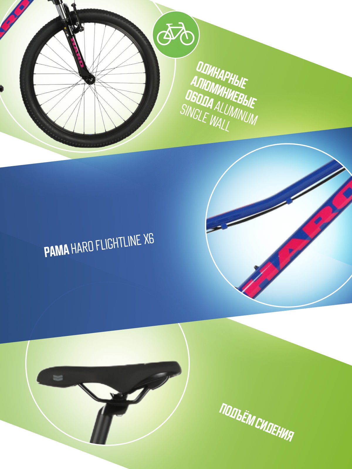 Велосипед, предназначенный для детей в возрасте от восьми до тринадцати лет, с навесным оборудованием Shimano, 7 скоростей. Технические особенности: алюминиевая рама Haro Flightline X6, амортизационная вилка HL 410E, одинарные алюминиевые обода Aluminum single wall, надежные ободные тормоза Promax TX-121 V-Brakes, защитная накладка на звезду системы, защита заднего переключателя. Подходит для обучения и прогулочного катания в городских условиях. Диаметр колес - 24 дюйма. Вес - 11,3 кг.