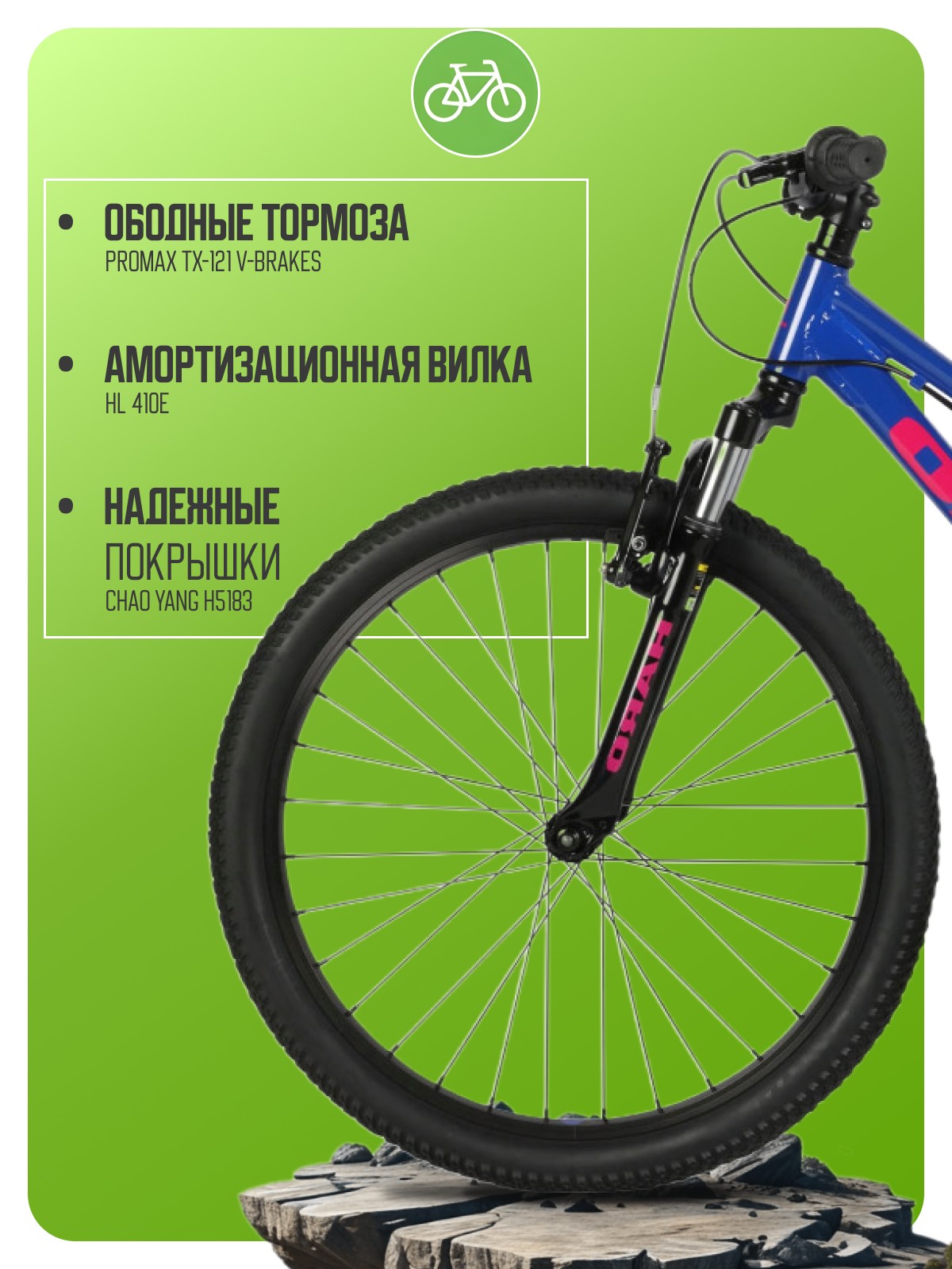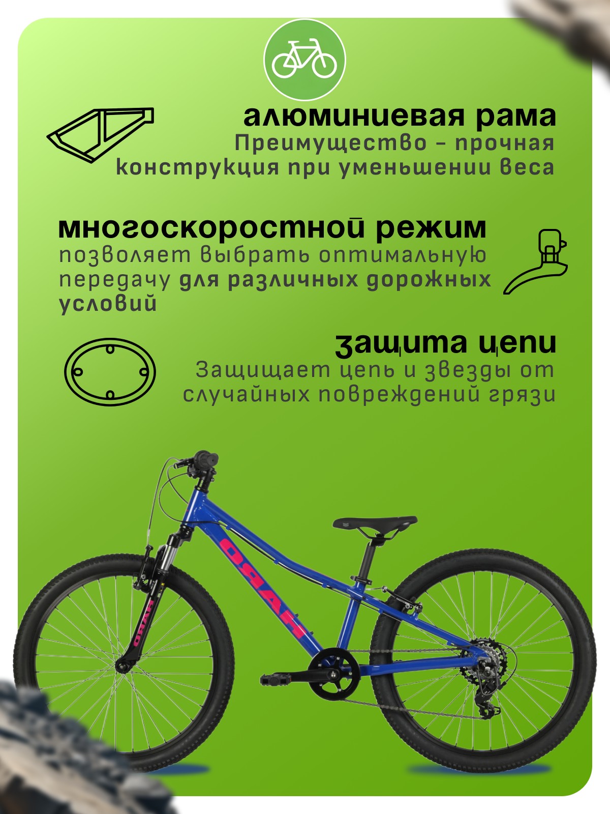 Особенности велосипеда: Алюминиевая рама, Амортизационная вилка, Защита цепи, Многоскоростной.