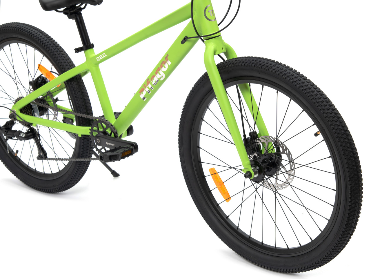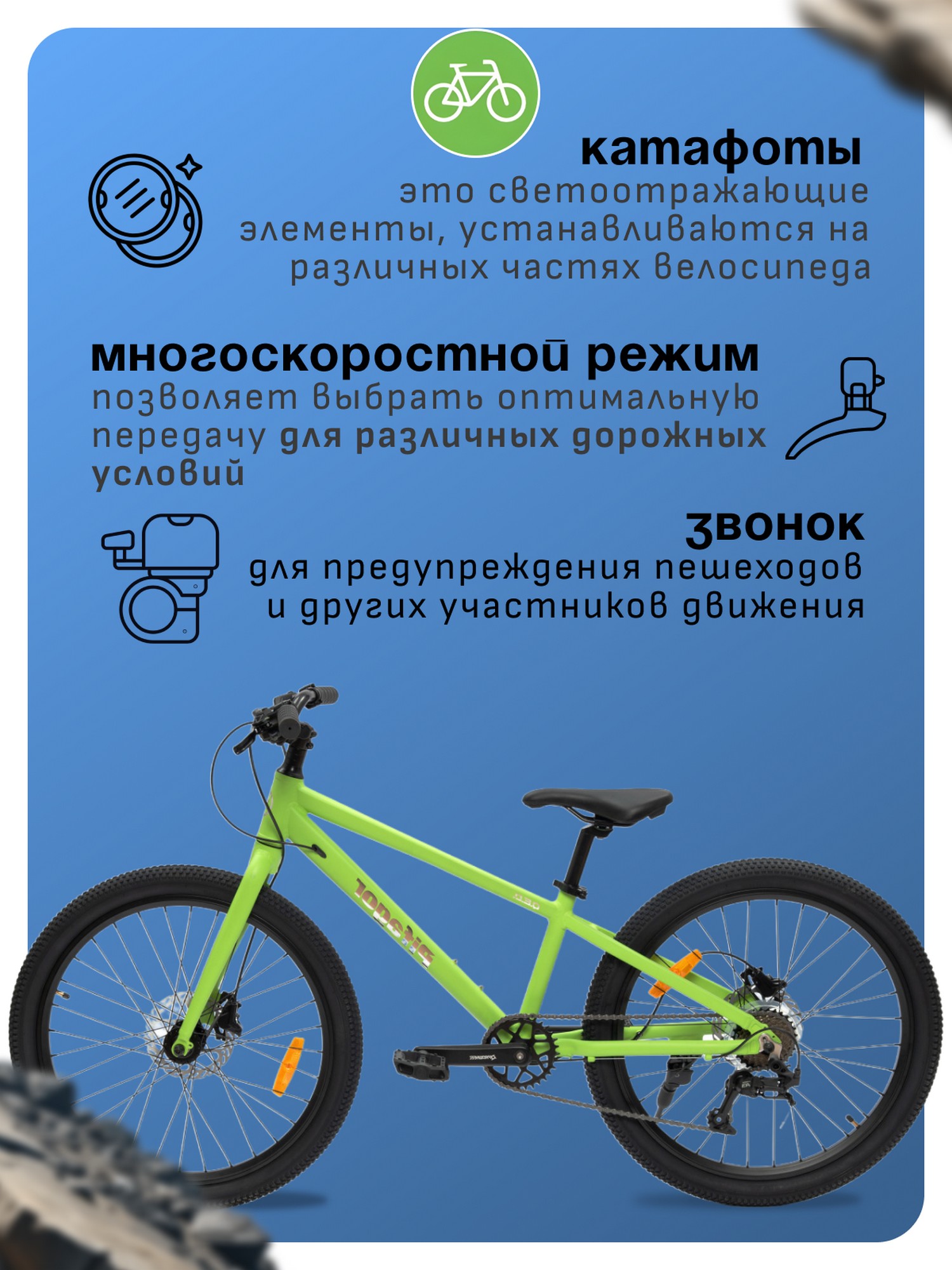 Велосипед, предназначенный для детей в возрасте от восьми до тринадцати лет, с оборудованием начального класса LTWOO, 8 скоростей. Технические особенности: легкая алюминиевая рама, жесткая алюминиевая вилка, двойные алюминиевые обода, дисковые механические тормоза Logan HD-M500, катафоты, подножка, звонок. Подходит для прогулочного катания в городских условиях и по несложным маршрутам в лесу. Максимальная нагрузка: до 90 кг. Диаметр колес - 24 дюйма. Вес - 11 кг.