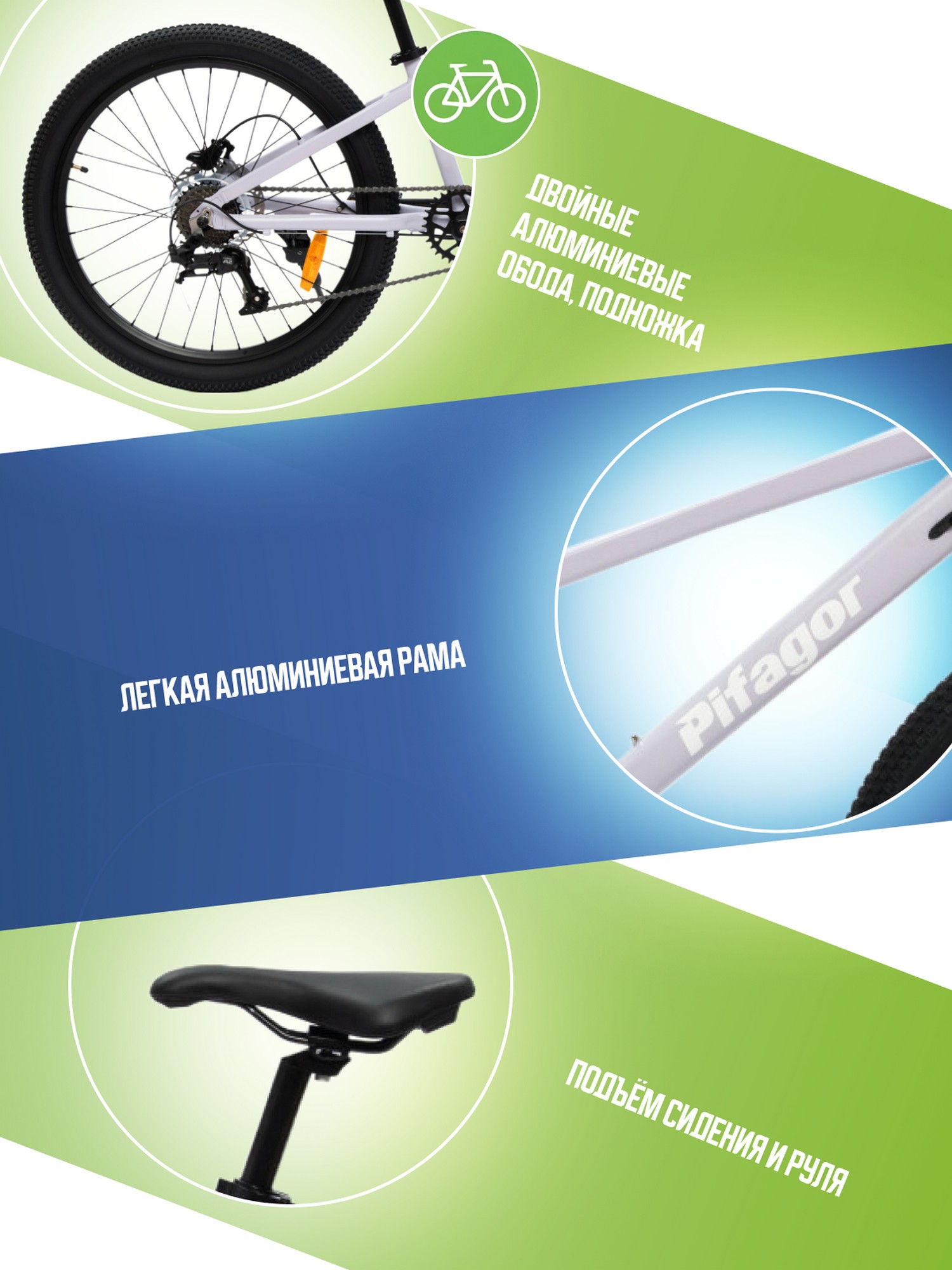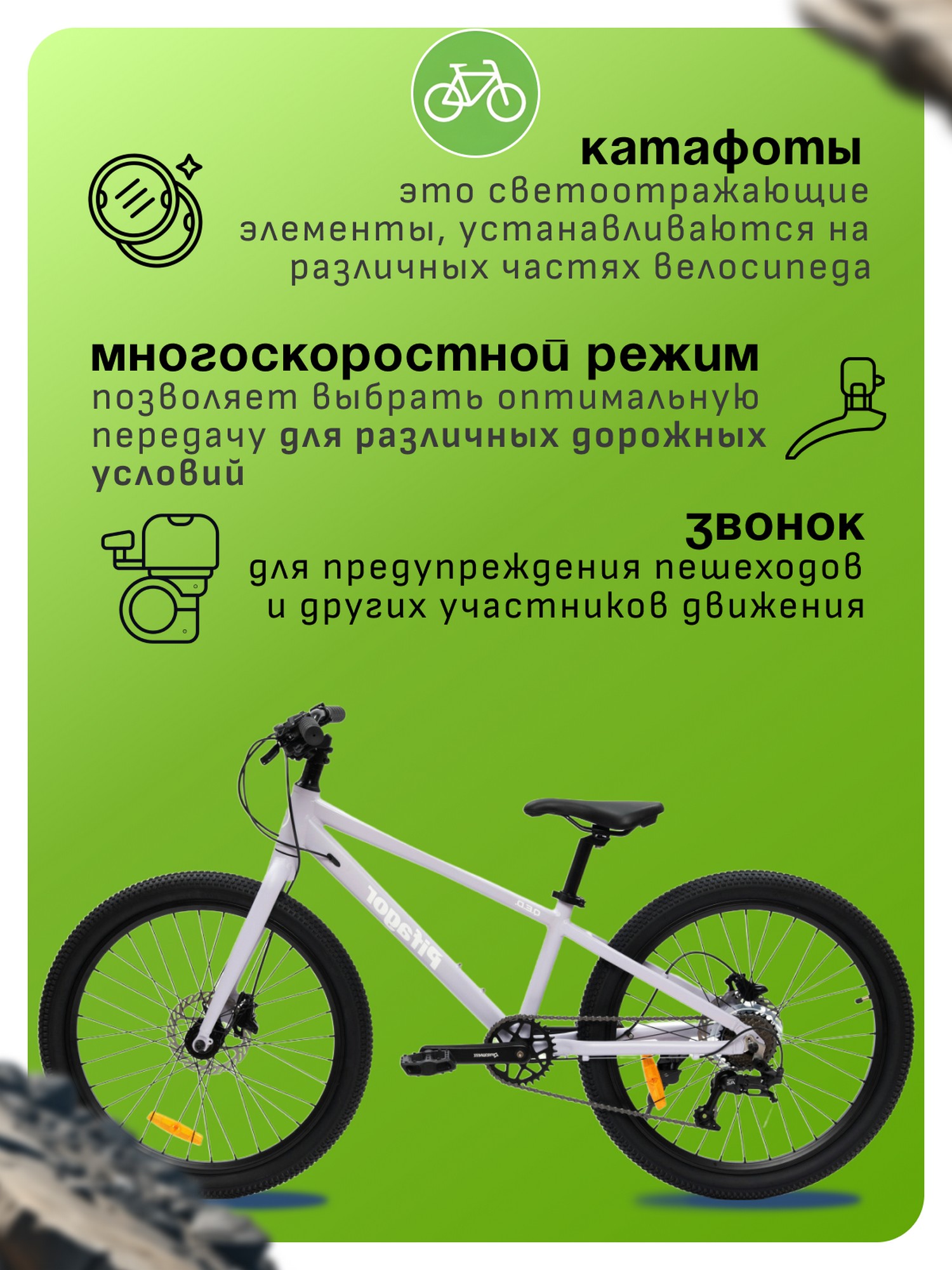 Особенности велосипеда: Алюминиевая рама, Гидравлический привод тормозов, Двойные обода, Дисковые тормоза, Звонок, Катафоты, Многоскоростной, Подножка.