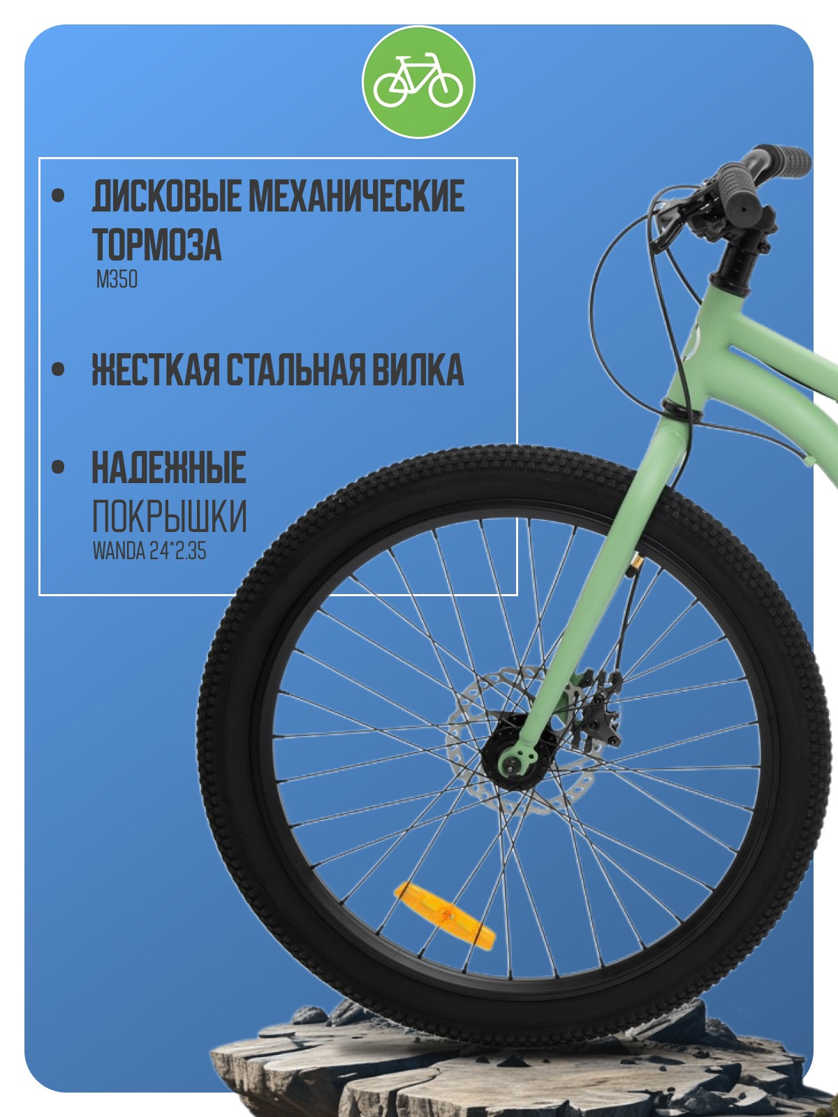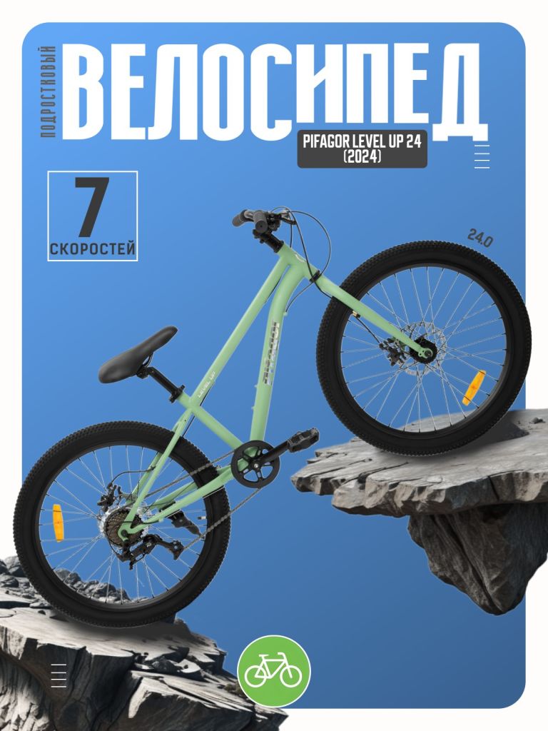 Велосипед, предназначенный для детей в возрасте от восьми до тринадцати лет, с оборудованием начального класса LTWOO, 7 скоростей. Технические особенности: прочная стальная рама, жесткая стальная вилка, двойные алюминиевые обода, дисковые механические тормоза M350, пластиковые крылья, катафоты, подножка, звонок, насос, накидной ключ и мультитул для сборки, фонарик. Подходит для прогулочного катания в городских условиях и по несложным маршрутам в лесу. Максимальная нагрузка: до 90 кг. Диаметр колес - 24 дюйма. Вес - 13,9 кг.