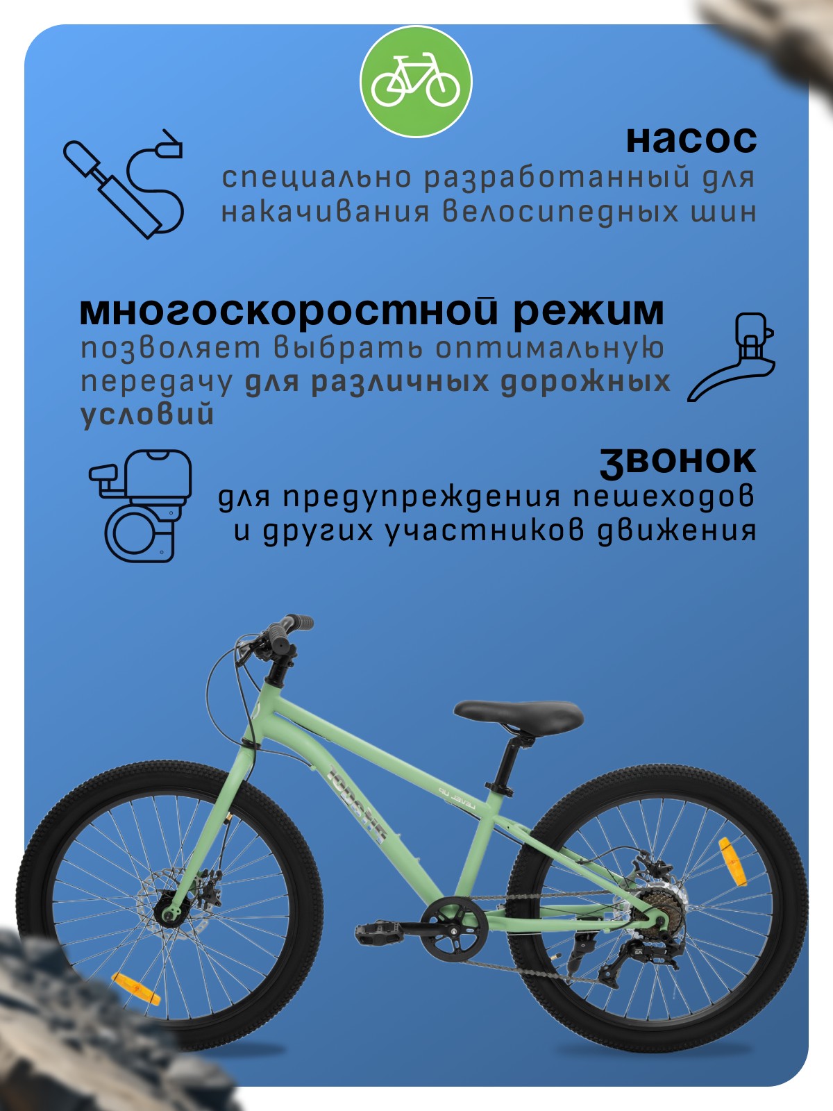 Особенности велосипеда: Двойные обода, Дисковые тормоза, Звонок, Катафоты, Крылья, Многоскоростной, Насос, Подножка, Фонарь.