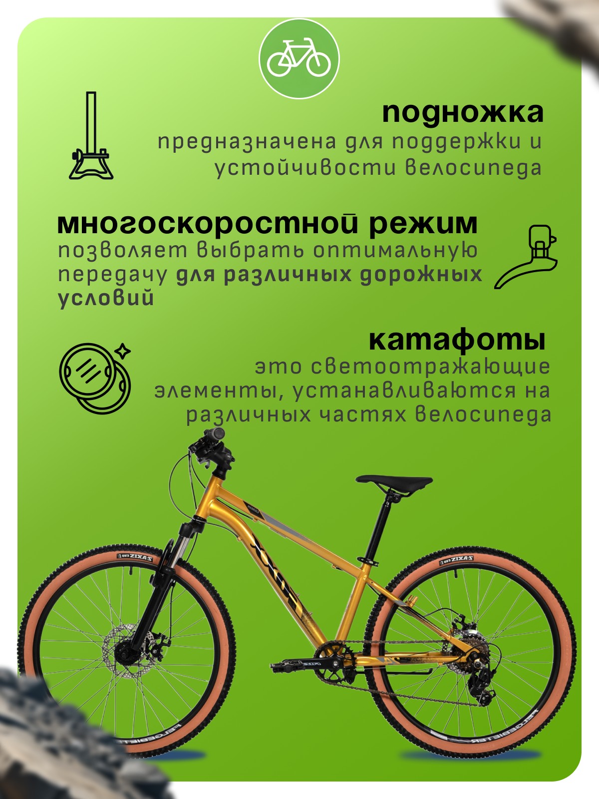 Особенности велосипеда: Амортизационная вилка, Двойные обода, Дисковые тормоза, Катафоты, Многоскоростной, Подножка.