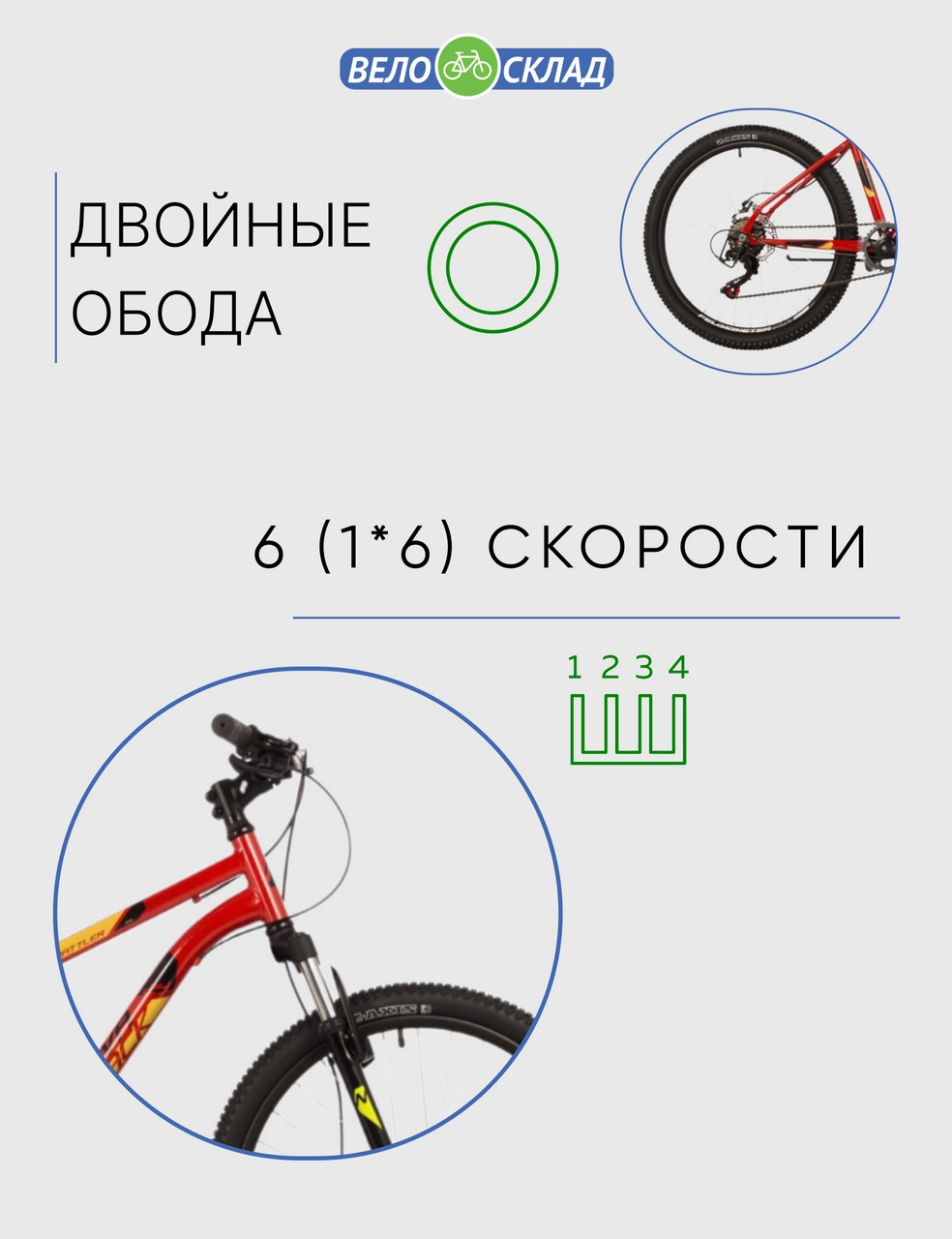Особенности велосипеда: Амортизационная вилка, Двойные обода, Дисковые тормоза, Звонок, Многоскоростной, Подножка.