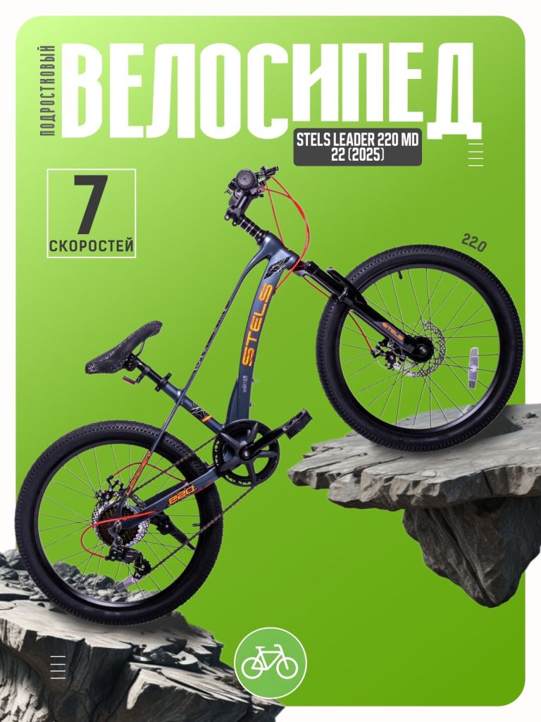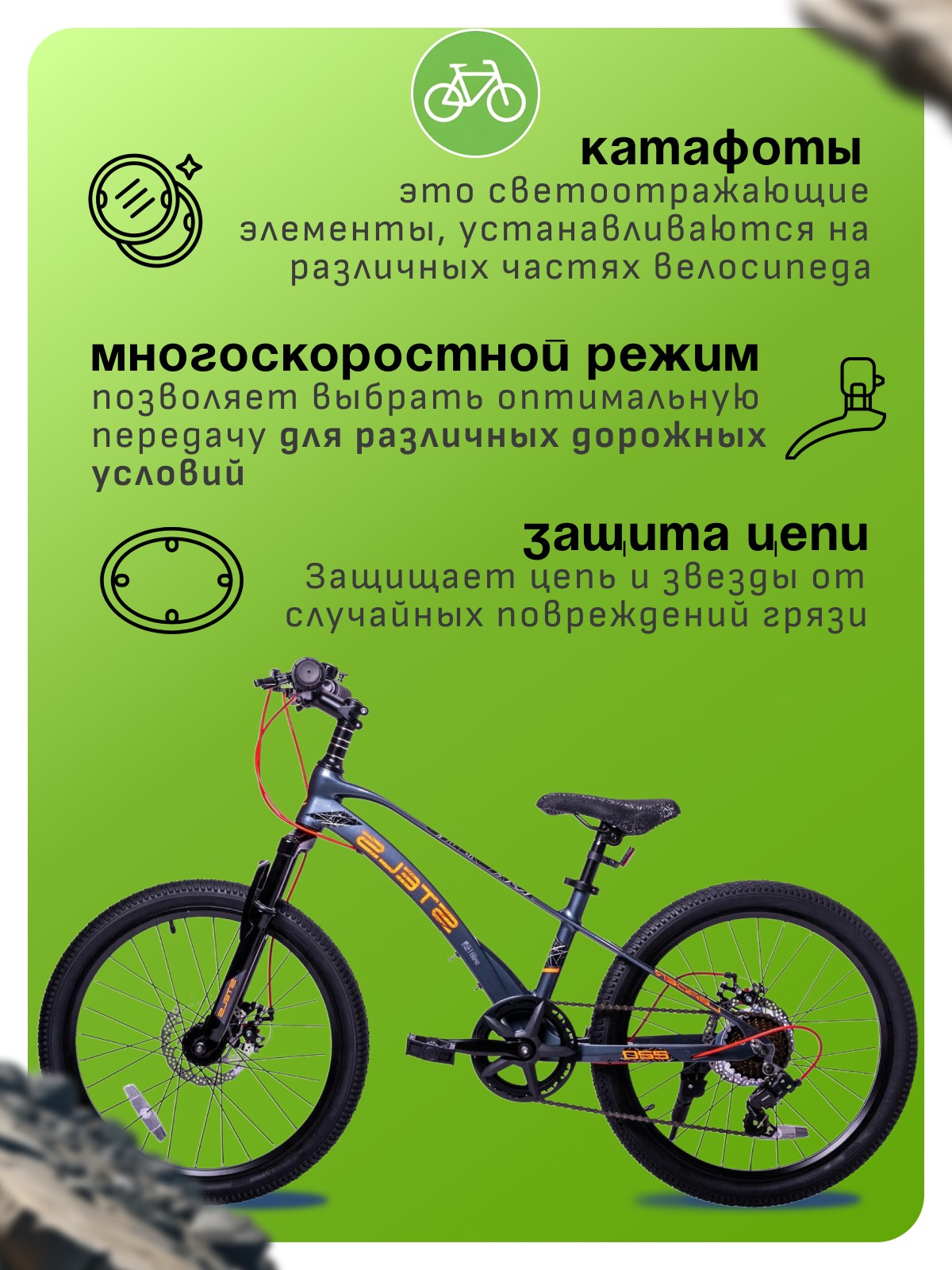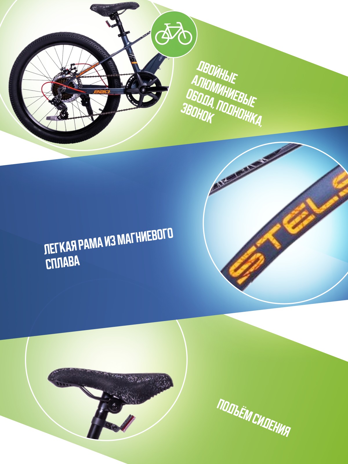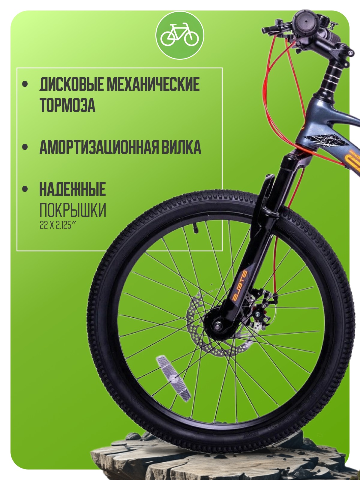 Велосипед, предназначенный для детей в возрасте от пяти до девяти лет, с оборудованием начального класса Shimano, 7 скоростей. Технические особенности: легкая рама из магниевого сплава, амортизационная вилка, двойные алюминиевые обода (под ниппель AV), дисковые механические тормоза (роторы 160/160 мм), защита цепи, катафоты, звонок, подножка. Подходит для прогулочного катания в городских условиях и по несложным маршрутам в лесу. Диаметр колес - 22 дюйма. Вес - 11 кг.