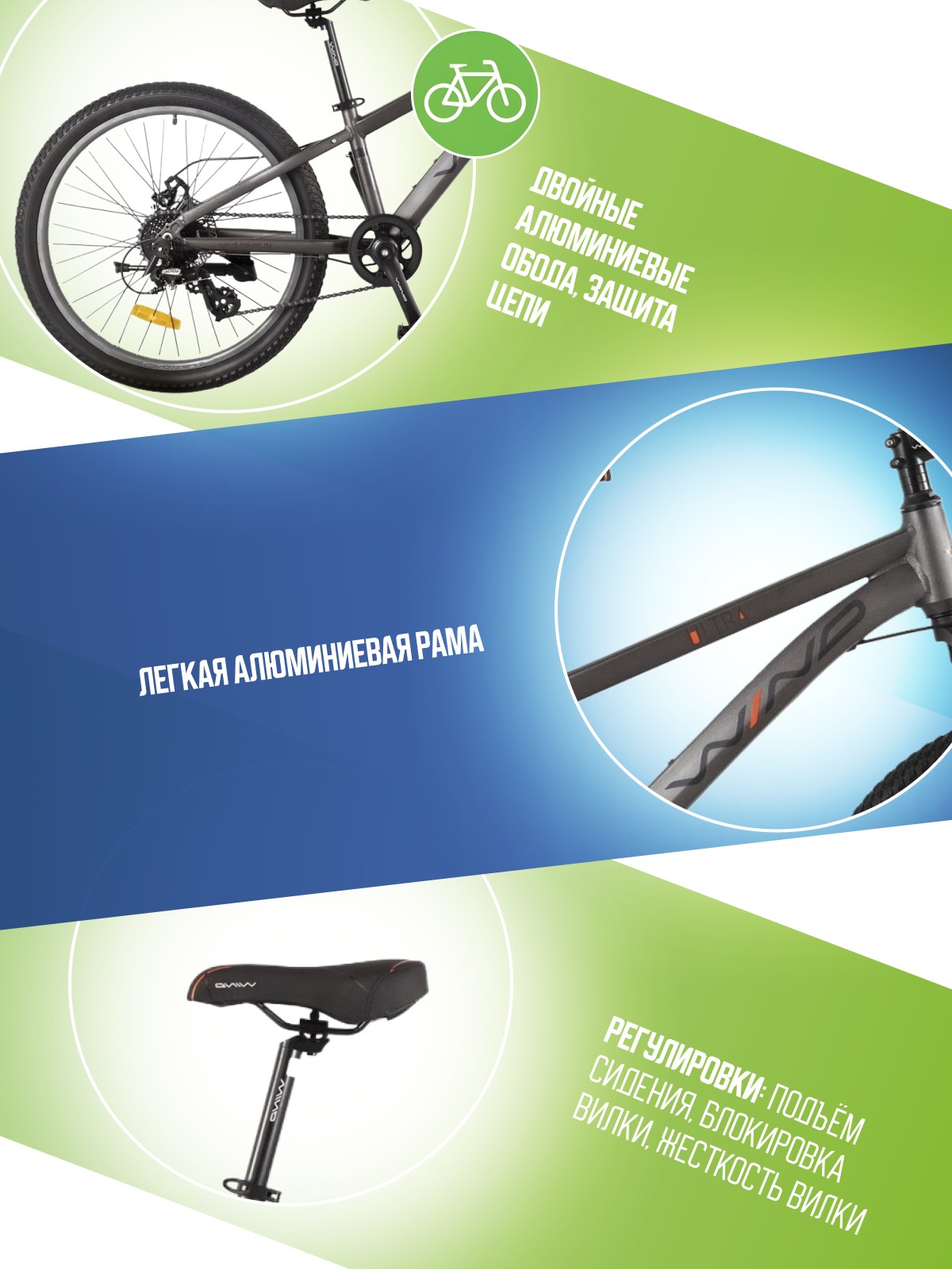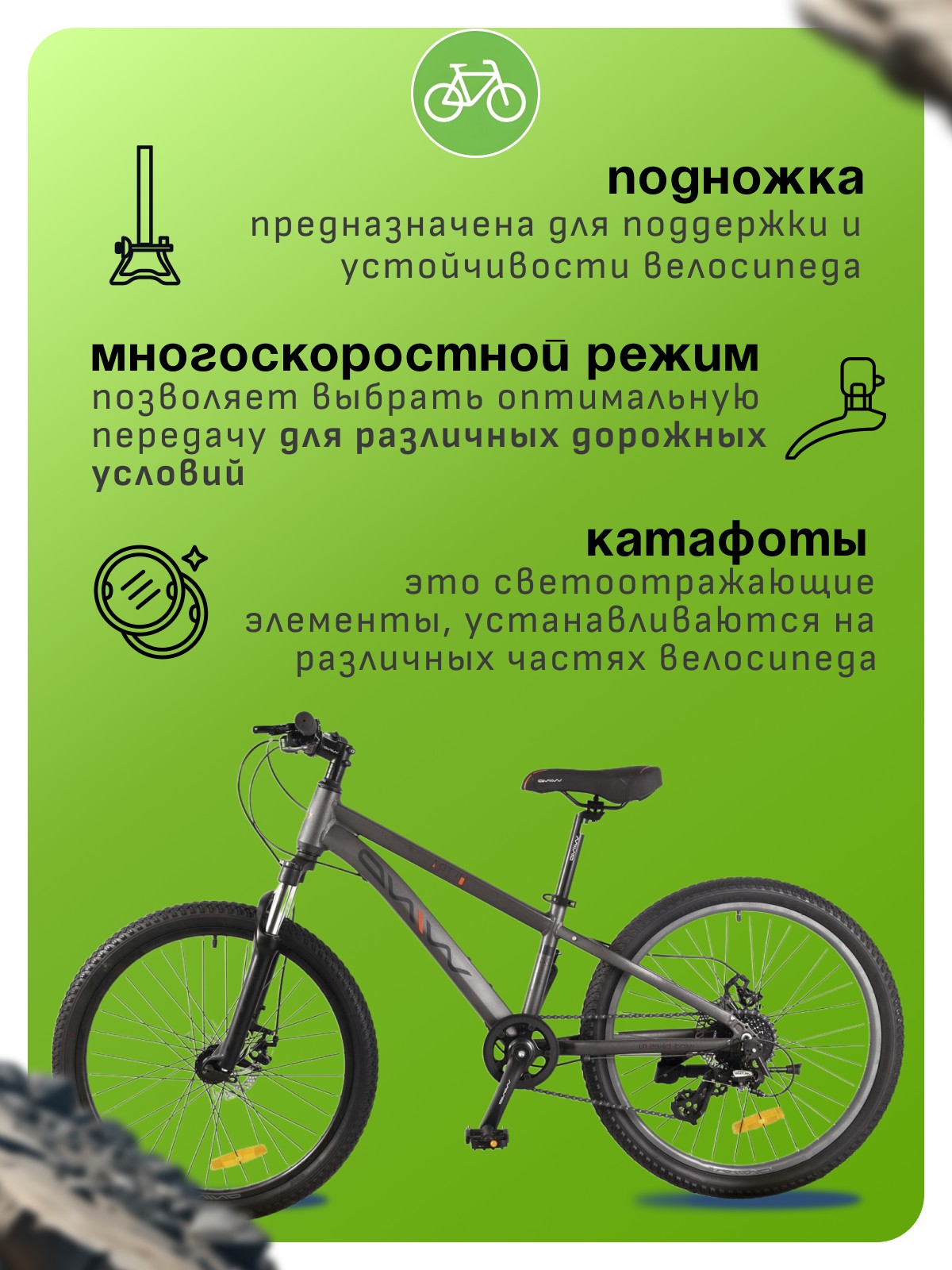 Особенности велосипеда: Алюминиевая рама, Амортизационная вилка, Двойные обода, Дисковые тормоза, Защита цепи, Катафоты, Многоскоростной, Подножка.