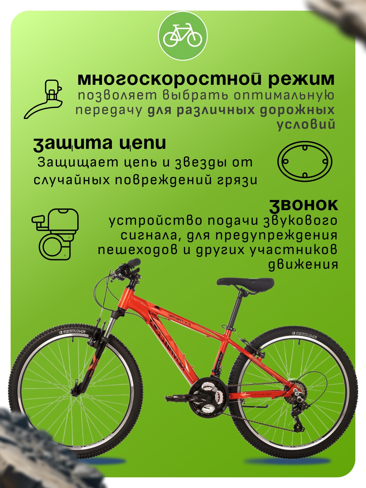 Велосипед, предназначенный для детей в возрасте от восьми до тринадцати лет, с оборудованием начального класса Shimano, 21 скорость. Технические особенности: легкая алюминиевая рама, амортизационная вилка Novatrack (пружинно-эластомерная, ход 40 мм), двойные алюминиевые обода, надежные ободные тормоза STG V-brake. Подходит для прогулочного катания в городских условиях и по несложным маршрутам в лесу. Диаметр колес - 24 дюйма. Вес - 14 кг.
