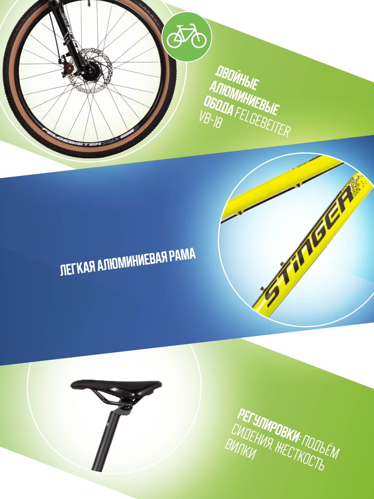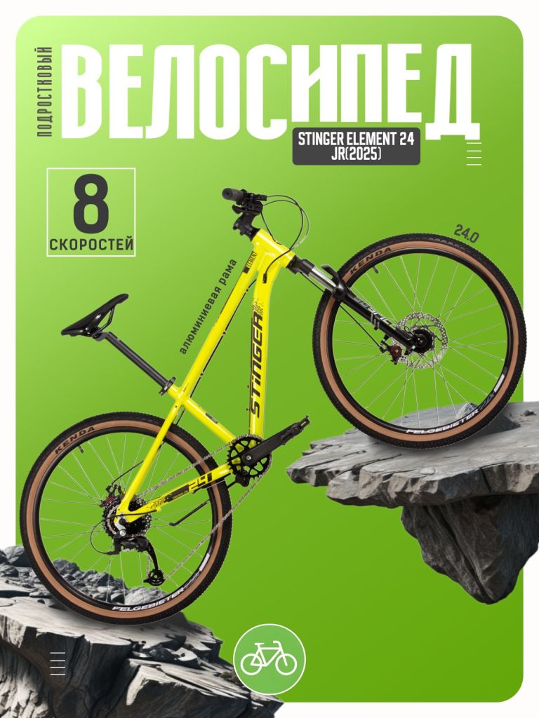 Велосипед, предназначенный для детей в возрасте от восьми до тринадцати лет, с навесным оборудованием Microshift, 8 скоростей. Технические особенности: легкая алюминиевая рама (сплав 6061, полуинтегрированная рулевая колонка, кареточный стакан BSA, частично скрытая прокладка тросов, съёмный петух), амортизационная вилка STG Spice (пружинная, ход 50 мм), двойные алюминиевые обода Felgebeiter VB-18 (под AV ниппель), дисковые механические тормоза STG (роторы 160/140 мм, крепление на 6 болтов), подножка, катафоты. Подходит для прогулочной езды по различным дорогам и пересеченной местности. Диаметр колес - 24 дюйма. Вес - 14,7 кг.
