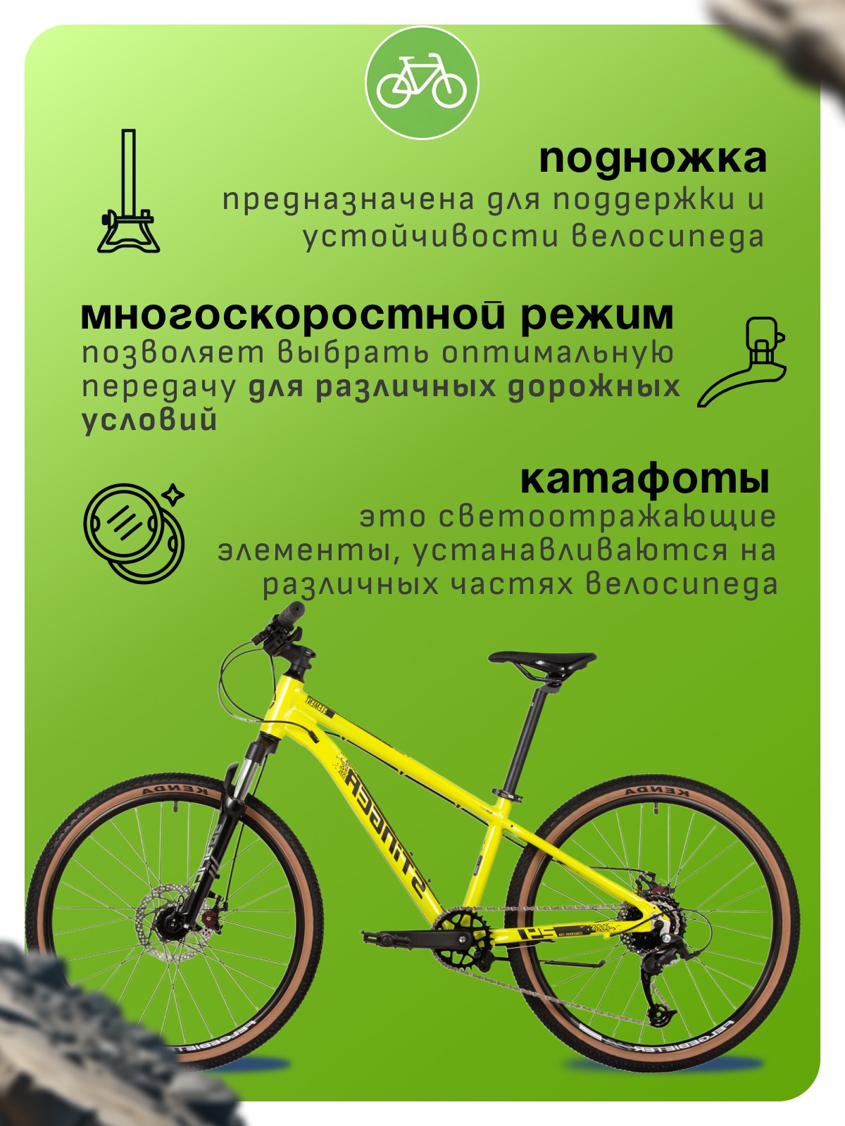 Особенности велосипеда: Алюминиевая рама, Амортизационная вилка, Двойные обода, Дисковые тормоза, Катафоты, Многоскоростной, Подножка.