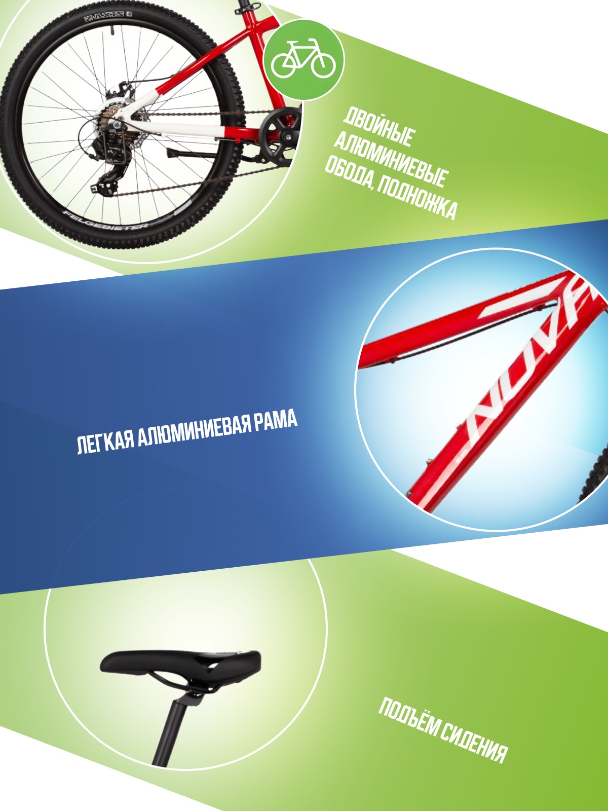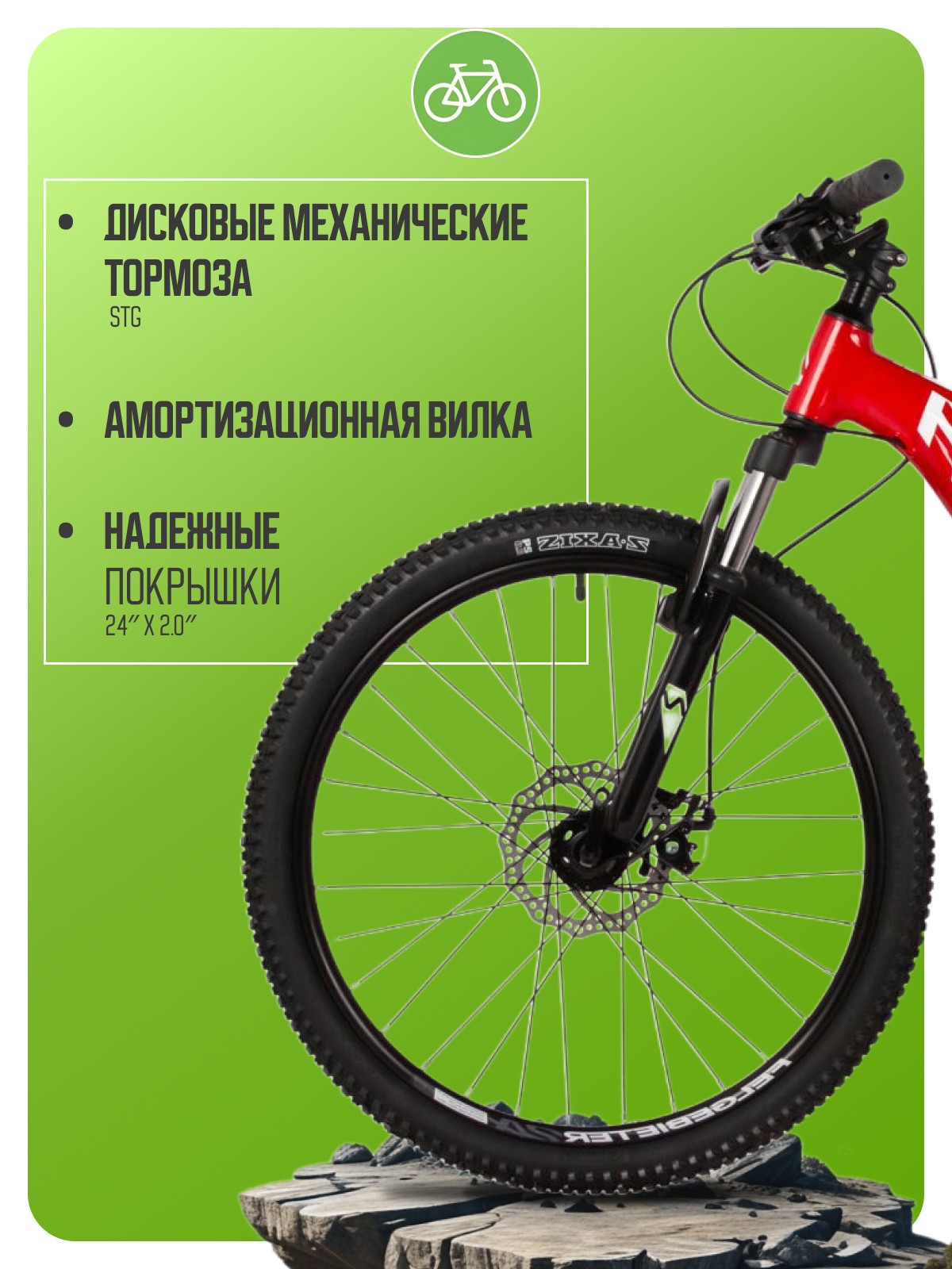 Велосипед, предназначенный для мальчиков в возрасте от восьми до тринадцати лет, с навесным оборудованием Shimano, 7 скоростей. Технические особенности: легкая алюминиевая рама (сплав 6061, сглаженные швы, полуинтегрированная рулевая колонка, кареточный стакан BSA, частично скрытая прокладка тросов, съёмный петух), амортизационная вилка Novatrack (пружинно-эластомерная, хромированные ноги, ход 40 мм, дропауты 10 мм), двойные алюминиевые обода (под ниппель A/V), дисковые механические тормоза STG (роторы 160/140 мм), защита цепи, защита заднего переключателя, подножка, звонок, катафоты. Подходит для прогулочного катания в городских условиях и по несложным маршрутам в лесу. Диаметр колес - 24 дюйма. Вес - 13,7 кг.