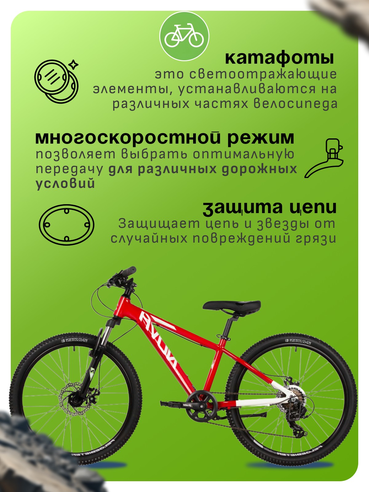 Особенности велосипеда: Алюминиевая рама, Амортизационная вилка, Двойные обода, Дисковые тормоза, Защита цепи, Катафоты, Многоскоростной, Подножка.