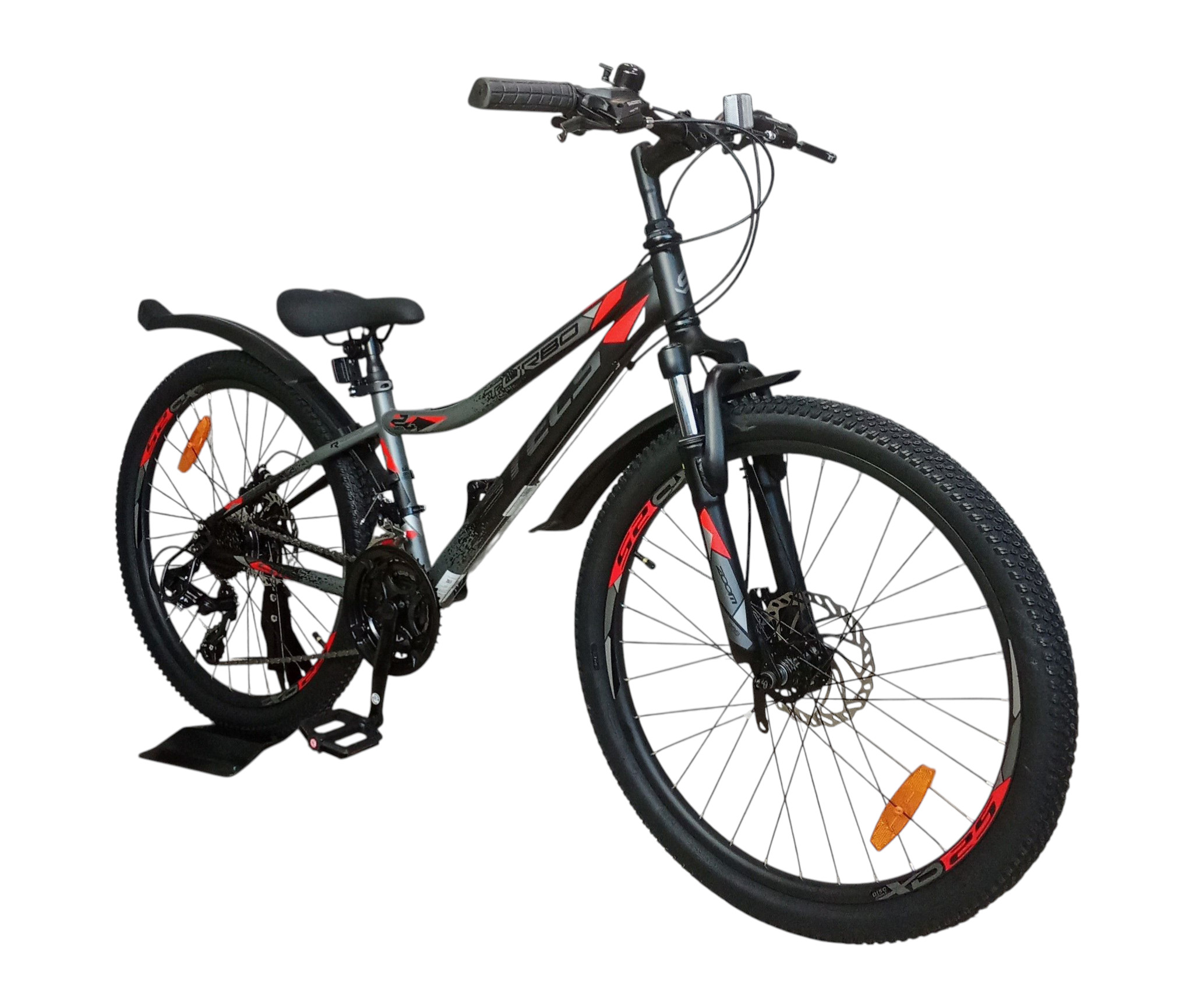 Подростковый велосипед с оборудованием начального класса Shimano, 21 скорость. Технические особенности: прочная стальная рама (открытая проводка, кареточный стакан BSA, прямой рулевой стакан, крепление калипера IS), амортизационная вилка Zoom (ход 50 мм, крепление калипера IS), двойные алюминиевые обода (под AV ниппель), дисковые механические тормоза (роторы 160/160 мм), защита заднего переключателя, катафоты, подножка, звонок. Подходит для прогулочной езды по ровным дорогам и по несложной пересеченной местности. Диаметр колес - 24 дюйма. Вес - 16,44 кг.