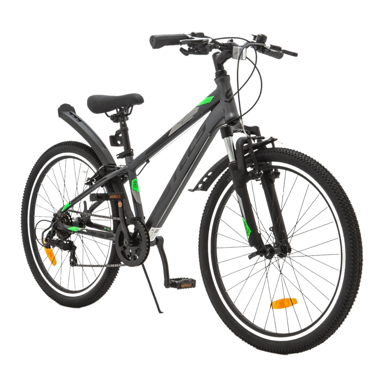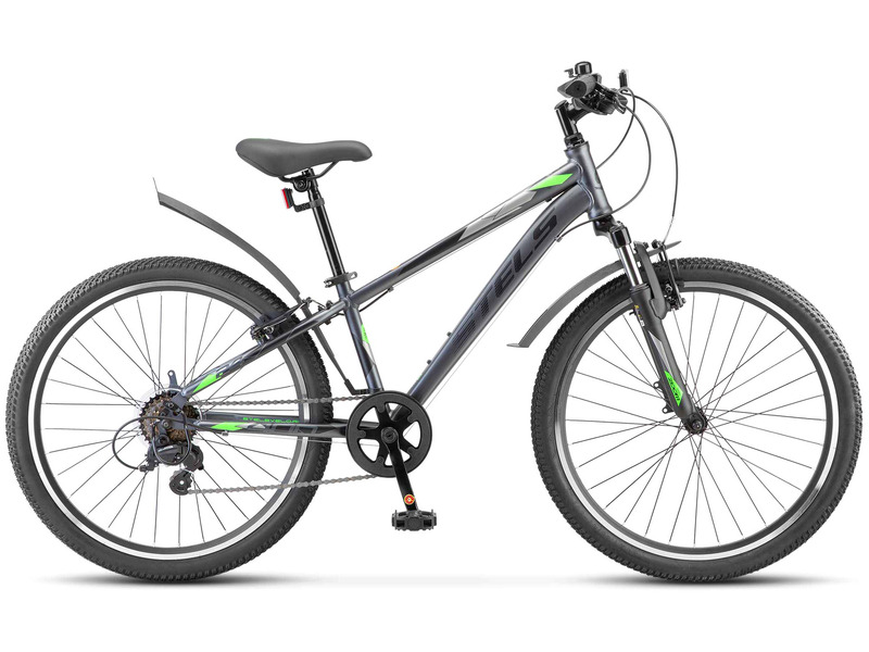 Велосипед, предназначенный для детей в возрасте от восьми до тринадцати лет, с навесным оборудованием Microshift, 6 скоростей. Технические особенности: прочная стальная рама (кареточный стакан BSA, интегрированный петух), амортизационная вилка (ход 50 мм, крепление калипера IS), двойные алюминиевые обода (под AV ниппель), надежные ободные тормоза V-типа, защита цепи, защита заднего переключателя, крылья, катафоты, звонок. Подходит для прогулочного катания в городских условиях и по несложным маршрутам в лесу. Диаметр колес - 24 дюйма. Вес - 15,42 кг.