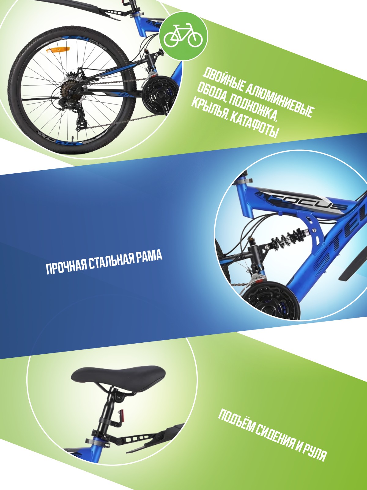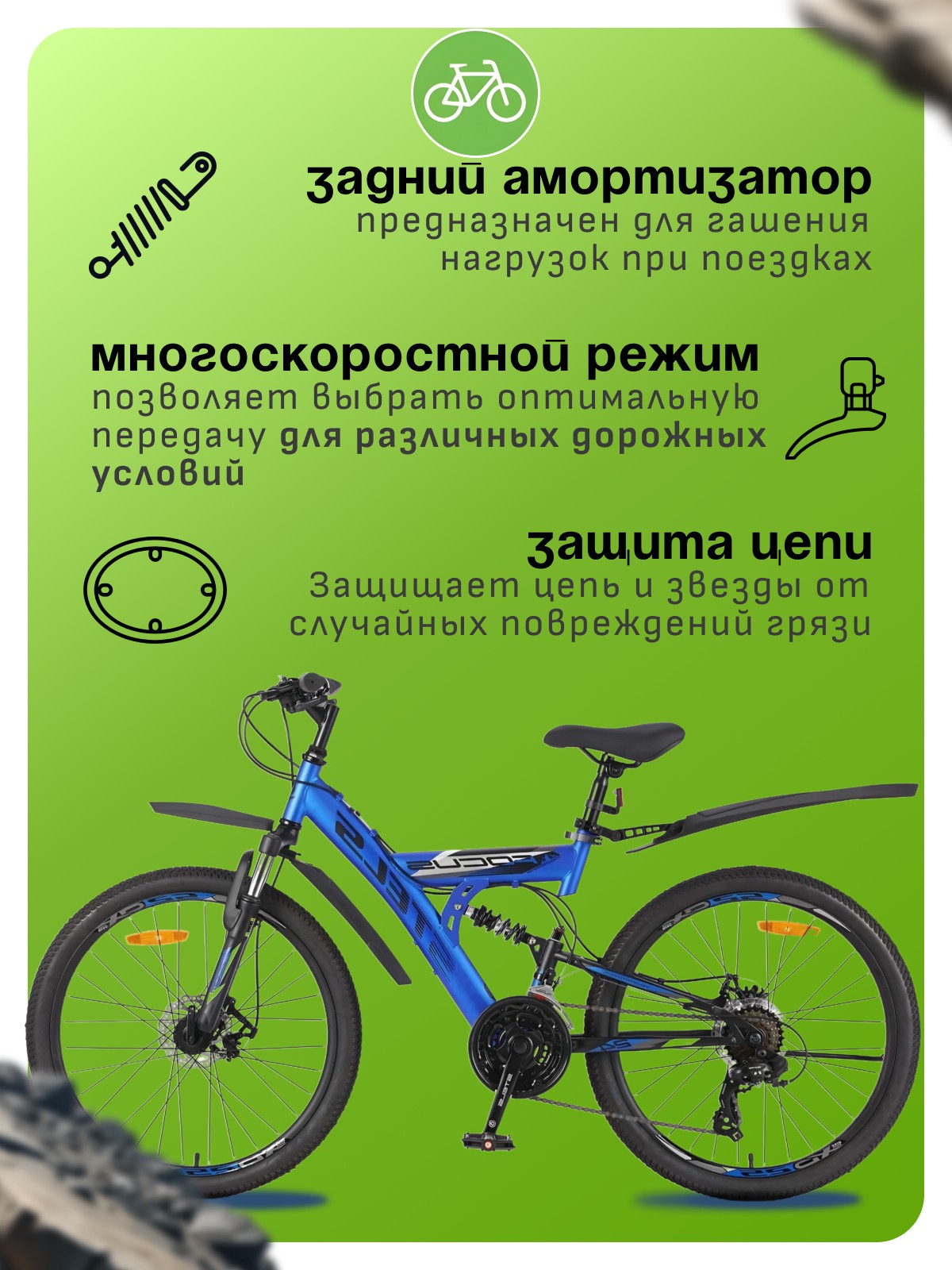 Особенности велосипеда: Амортизационная вилка, Двойные обода, Дисковые тормоза, Задний амортизатор, Защита цепи, Катафоты, Крылья, Многоскоростной, Подножка.