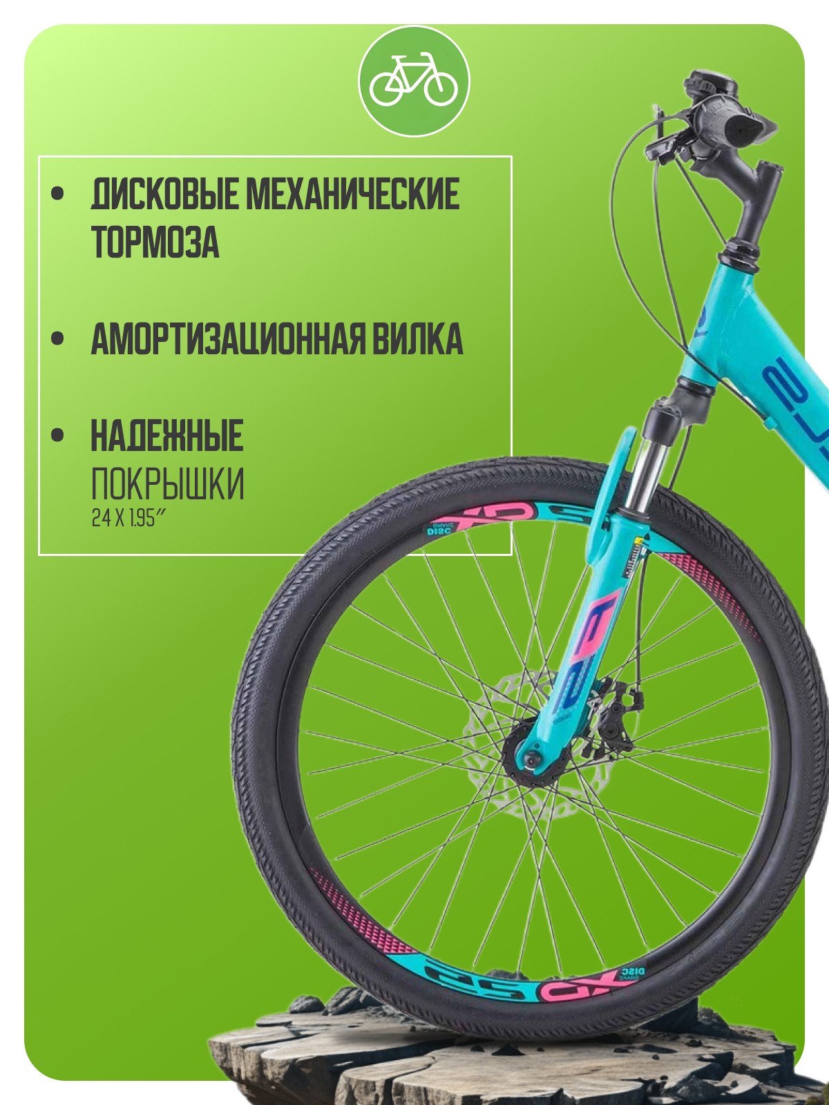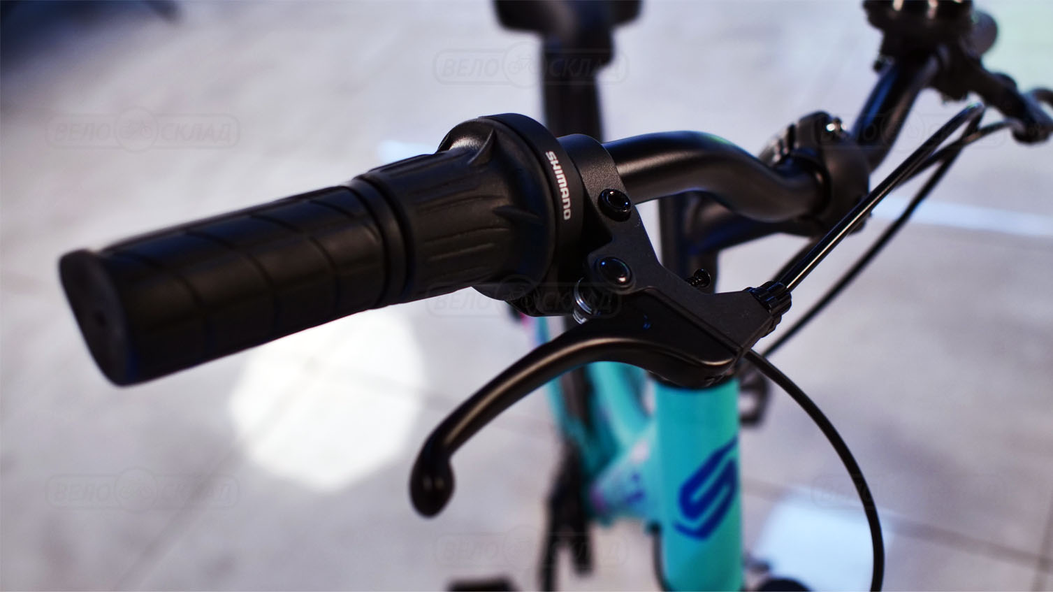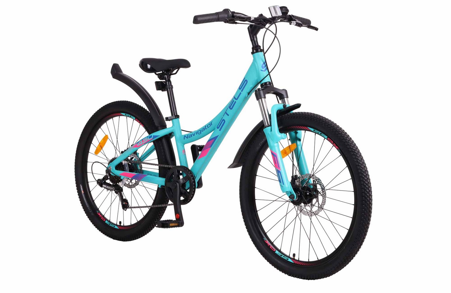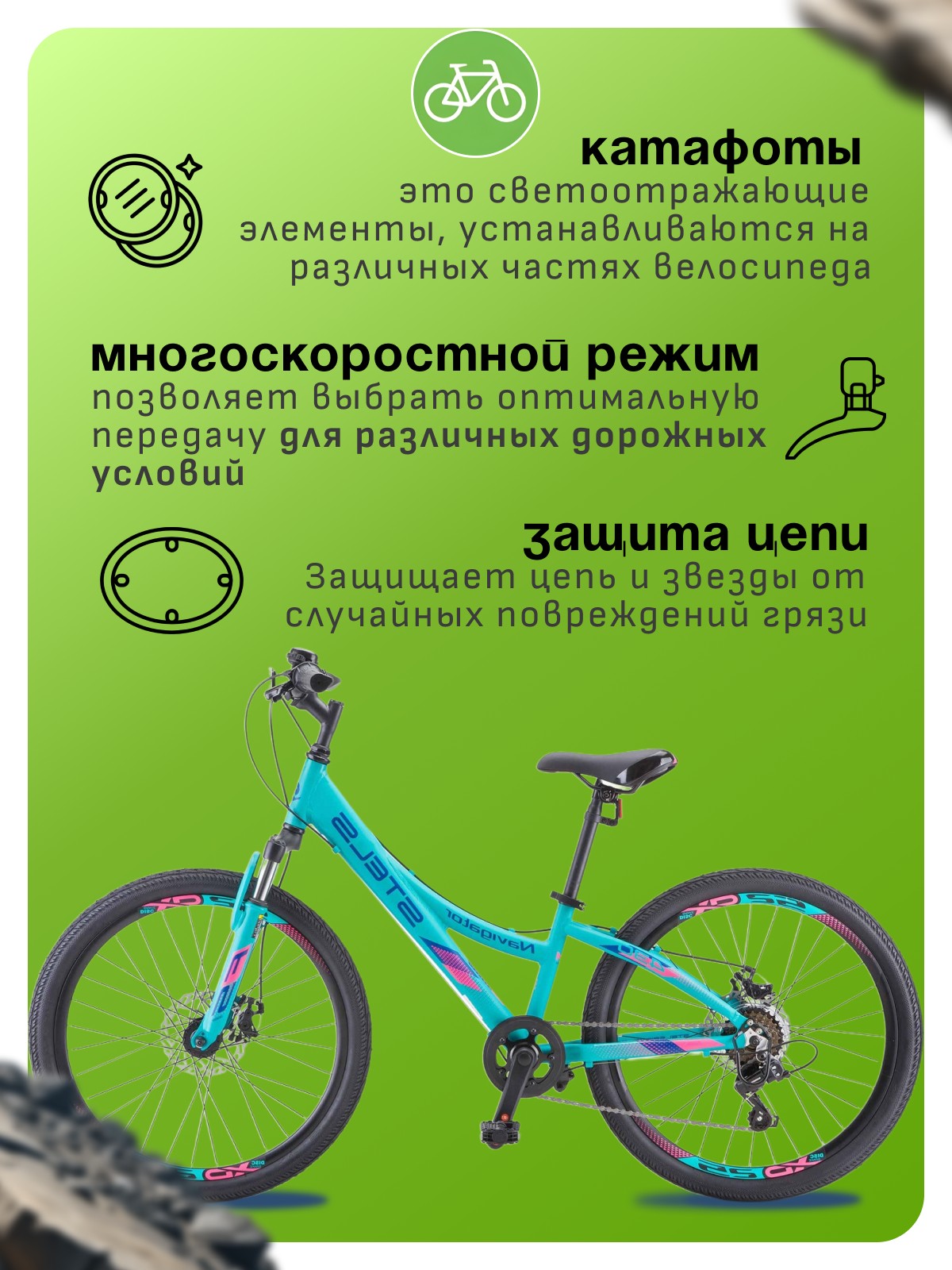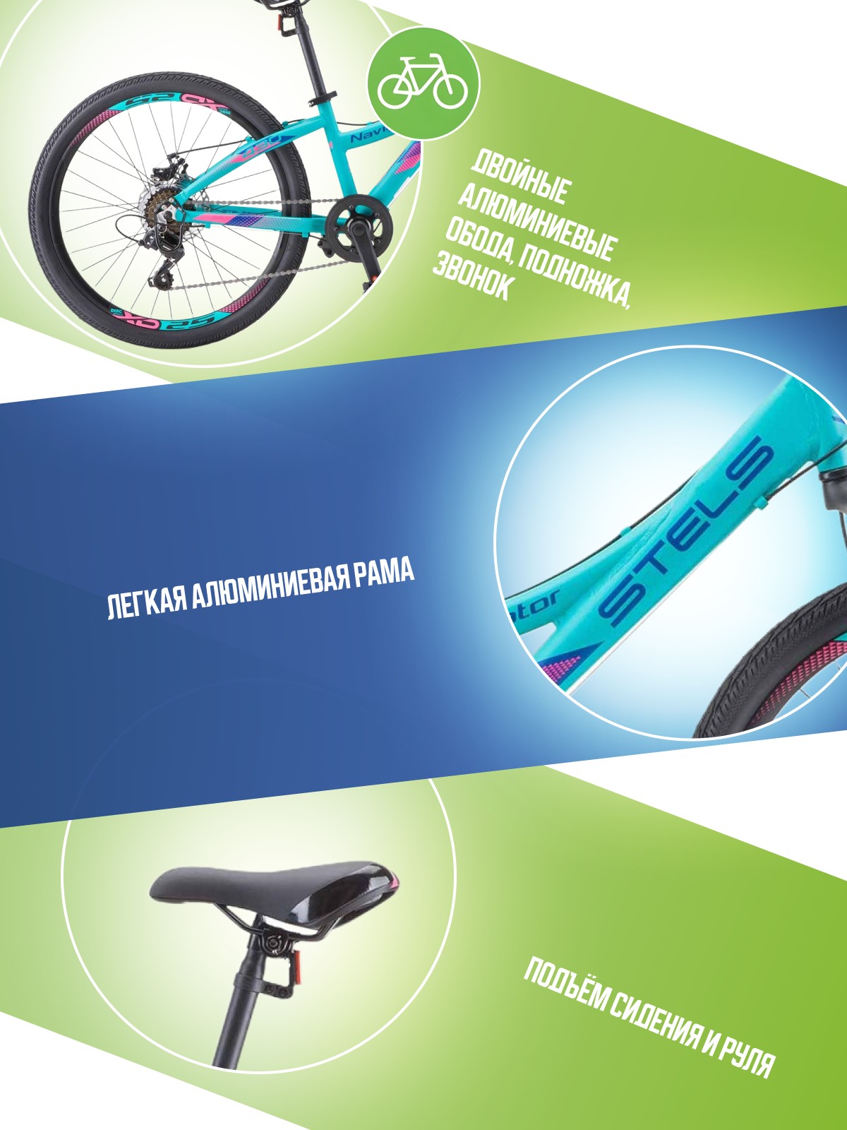 Велосипед, предназначенный для детей в возрасте от восьми до тринадцати лет, с оборудованием начального класса Shimano, 6 скоростей. Технические особенности: легкая алюминиевая рама, амортизационная вилка (ход 40 мм), двойные алюминиевые обода, дисковые механические тормоза (роторы 160/160 мм), защита цепи, звонок, катафоты, подножка, защита заднего переключателя. Подходит для прогулочного катания в городских условиях и по несложным маршрутам в лесу. Диаметр колес - 24 дюйма. Вес - 14,18 кг.