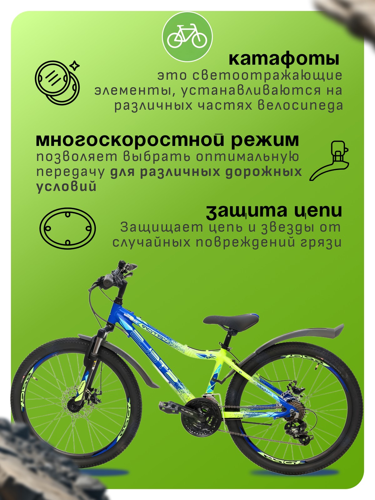 Особенности велосипеда: Алюминиевая рама, Амортизационная вилка, Двойные обода, Дисковые тормоза, Защита цепи, Звонок, Катафоты, Многоскоростной, Подножка.