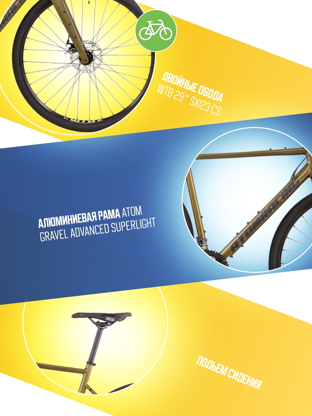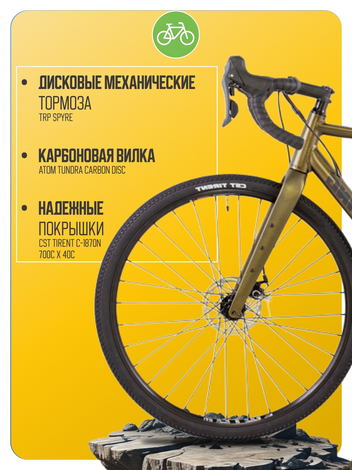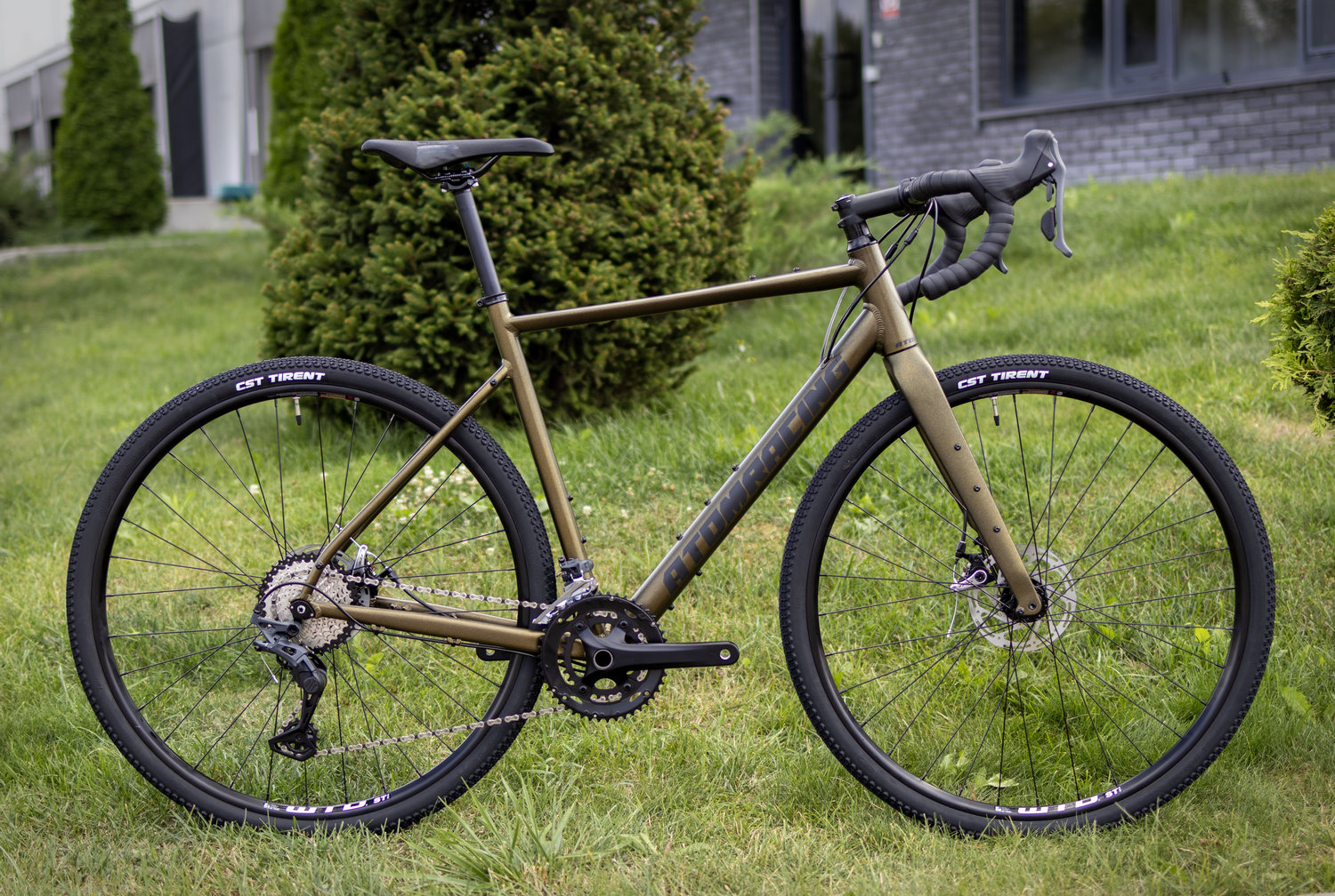 Гравийный велосипед с оборудованием высшего любительского класса Microshift, 20 скоростей. Технические особенности: алюминиевая рама ATOM Gravel advanced superlight (тройной баттинг, внутренняя проводка, дропауты под полую ось), жесткая карбоновая вилка ATOM Tundra Carbon Disc (дропауты под полую ось), двойные обода WTB 29″ SXi23 CS, дисковые механические тормоза TRP Spyre (роторы Tektro TR-24 160/160 мм). Подходит для активной езды по различным дорогам и пересеченной местности. Диаметр колес - 28 дюймов. Вес - 10,6 кг.