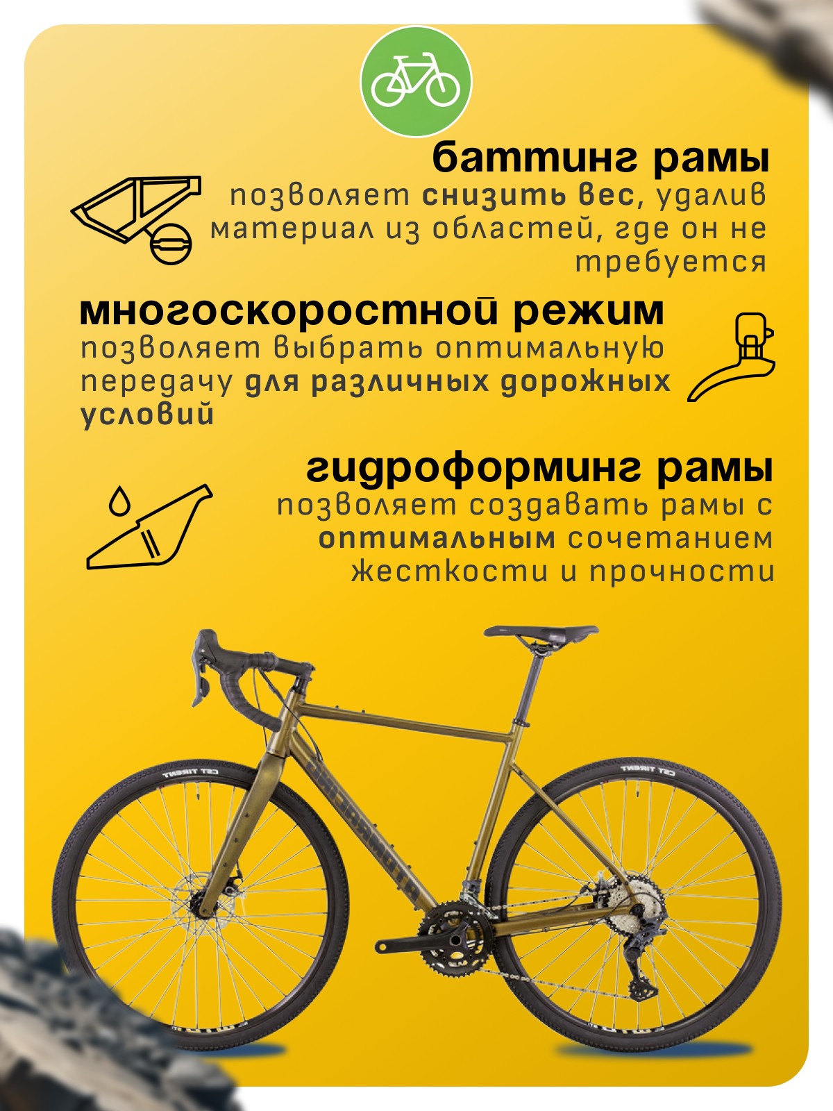 Алюминиевая рама, Баттинг рамы, Гидроформинг рамы, Двойные обода, Дисковые тормоза, Многоскоростной