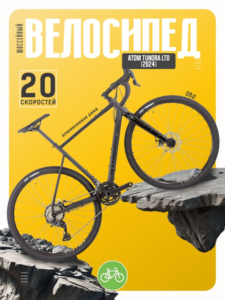 Гравийный велосипед с оборудованием высшего любительского класса Microshift, 20 скоростей. Технические особенности: алюминиевая рама ATOM Gravel advanced superlight (тройной баттинг, внутренняя проводка, дропауты под полую ось), жесткая карбоновая вилка ATOM Tundra Carbon Disc (дропауты под полую ось), двойные обода WTB 29″ SXi23 CS, дисковые механические тормоза TRP Spyre (роторы Tektro TR-24 160/160 мм). Подходит для активной езды по различным дорогам и пересеченной местности. Диаметр колес - 28 дюймов. Вес - 10,6 кг.