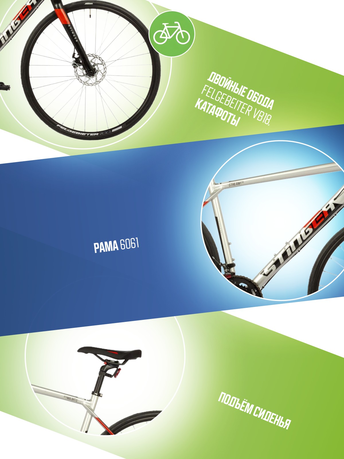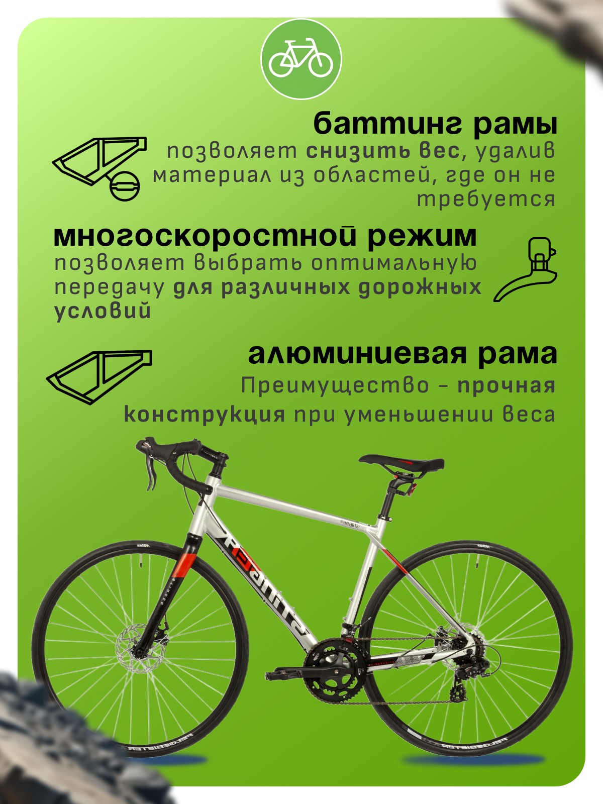Алюминиевая рама, Баттинг рамы, Двойные обода, Дисковые тормоза, Катафоты, Многоскоростной