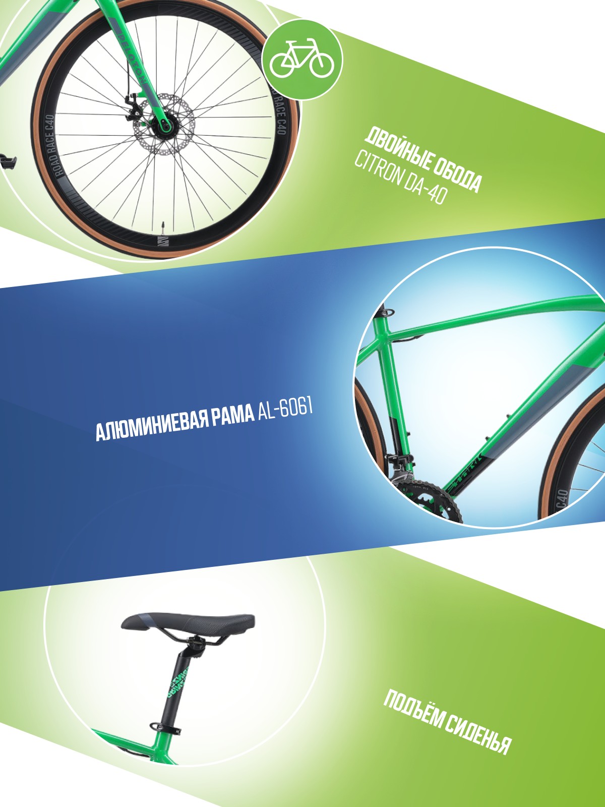 Алюминиевая рама, Баттинг рамы, Гидроформинг рамы, Двойные обода, Дисковые тормоза, Многоскоростной