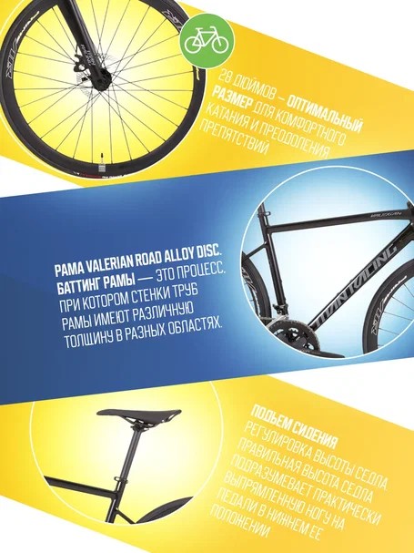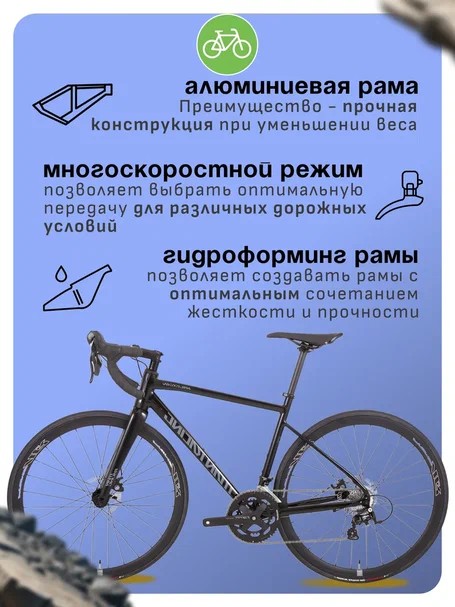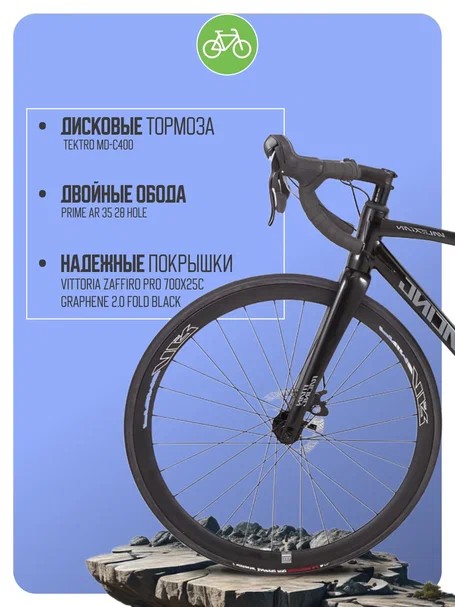 Шоссейный велосипед продвинутого уровня c оборудованием высшего любительского класса Microshift, 20 скоростей. Технические особенности: алюминиевая рама Valerian Road Alloy Disc, жесткая карбоновая вилка Carbon Road F61 Disc, двойные обода Prime AR 35, дисковые механические тормоза Tektro MD-C400 Disc. Подходит для быстрой спортивной езды по шоссе и участия в гонках. Диаметр колес - 28 дюймов. Вес - 11 кг.