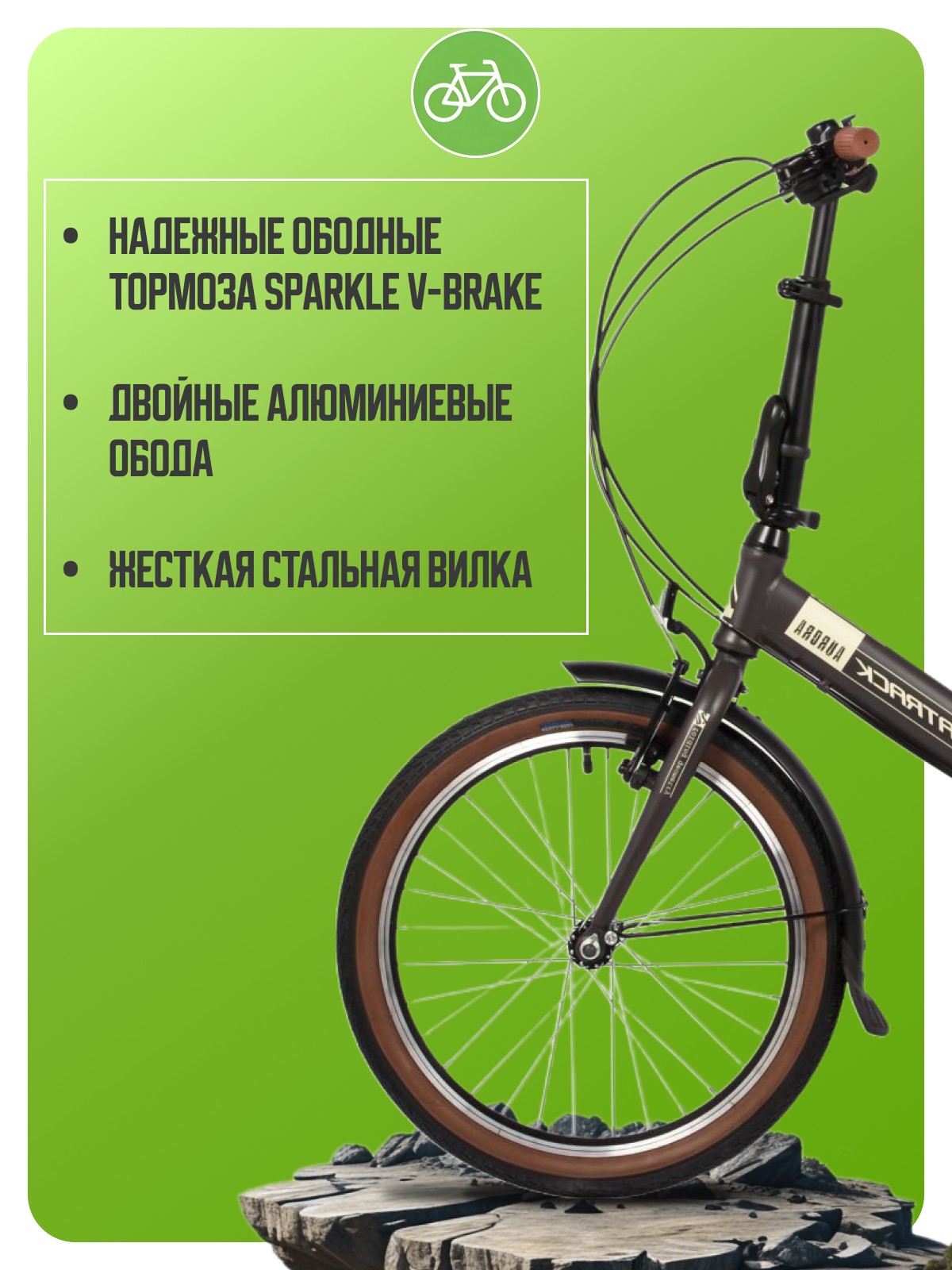 Складной велосипед с оборудованием начального класса Shimano, 6 скоростей. Технические особенности: складная стальная рама, жесткая стальная вилка, двойные алюминиевые обода, надежные ободные тормоза Sparkle V-brake, длинные крылья, комфортное седло, багажник, звонок, подножка. Подходит для прогулочного катания в городских условиях. Диаметр колес - 20 дюймов. Вес - 14,5 кг.
